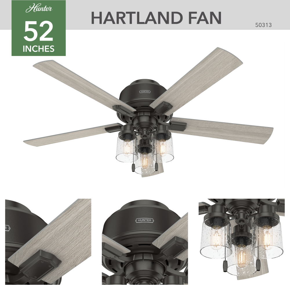 The Hartland chandelier inspired ceiling fan?s clear seeded glass and included Edison LED light bulbs create a stunning look in large, casual spaces. This large ceiling fan is designed to fit flush in rooms with ceilings less than 9 feet high. Use the Indigo Blue finish to add a subtle pop of color or complement other fixtures in your space with the Noble Bronze or Matte Silver finish. Create a cohesive look in your space by pairing the Hartland ceiling fan with the coordinating light fixtures in its collection.