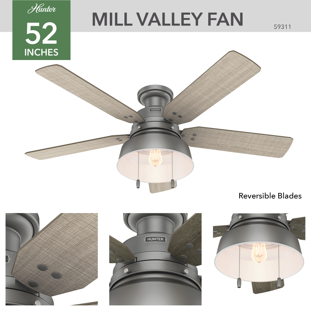 Industrial and rustic design come together on the Mill Valley low-profile ceiling fan with details including the vintage-looking rivets securing the blades, coin-edge thumbscrews, and barn-style open hood light. Style meets performance with the Mill Valley?s white hood reflector that maximizes light from a vintage-style energy-efficient LED Edison bulb. Perfect for areas exposed to moisture and humidity, this damp-rated fan completes the look of casual farmhouse living spaces or patios with low ceilings. The Mill Valley Collection is available in a variety of finishes and mounting options to customize the look of your room's rustic home decor while maintaining a consistent style throughout your home.