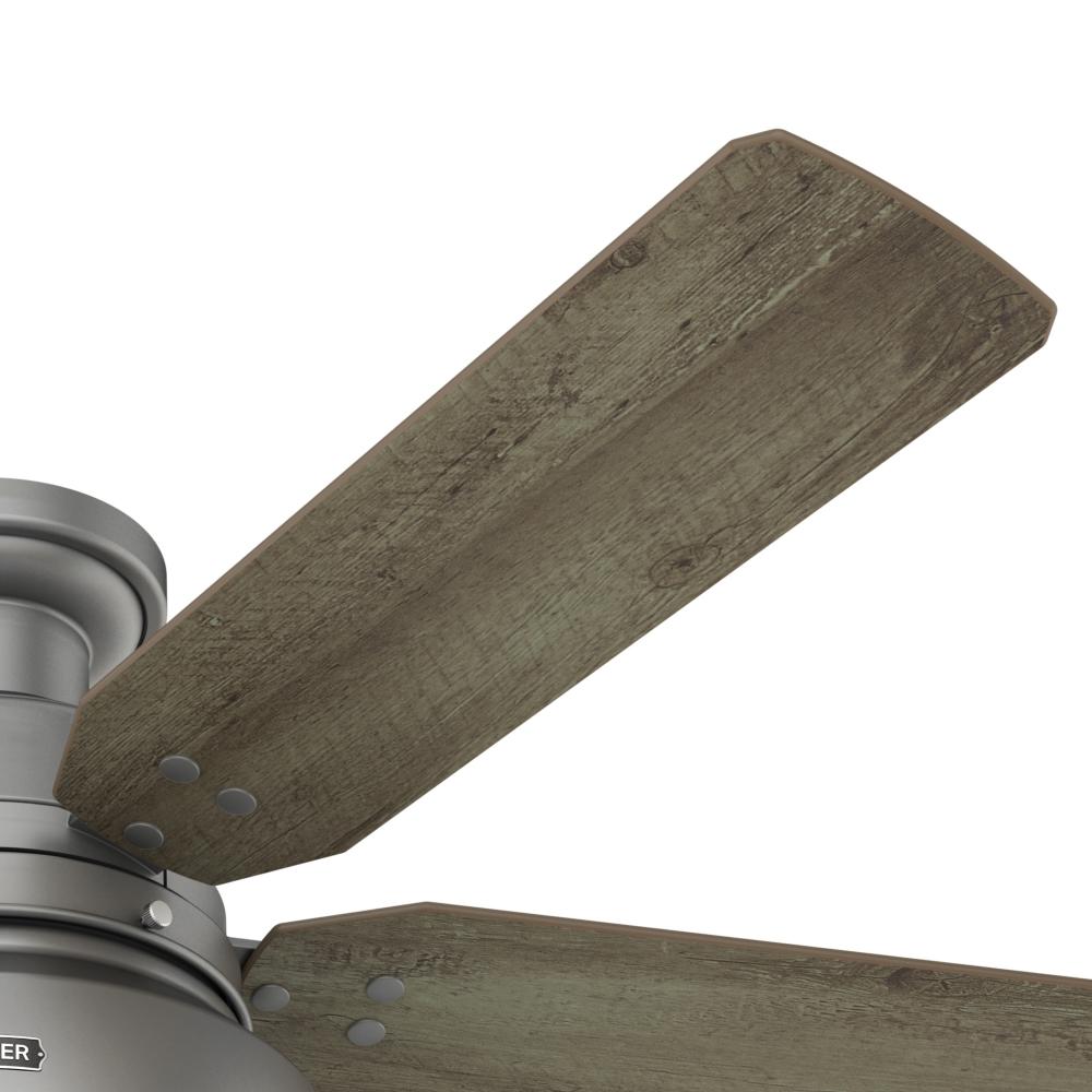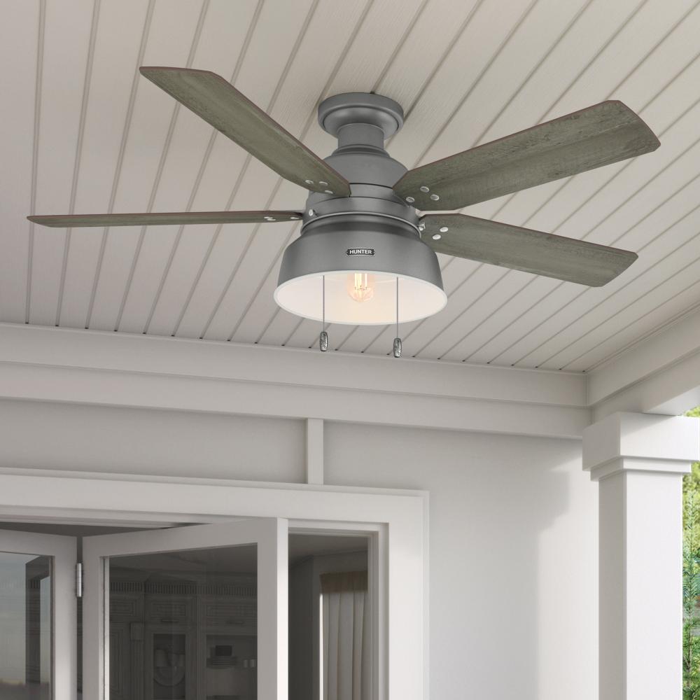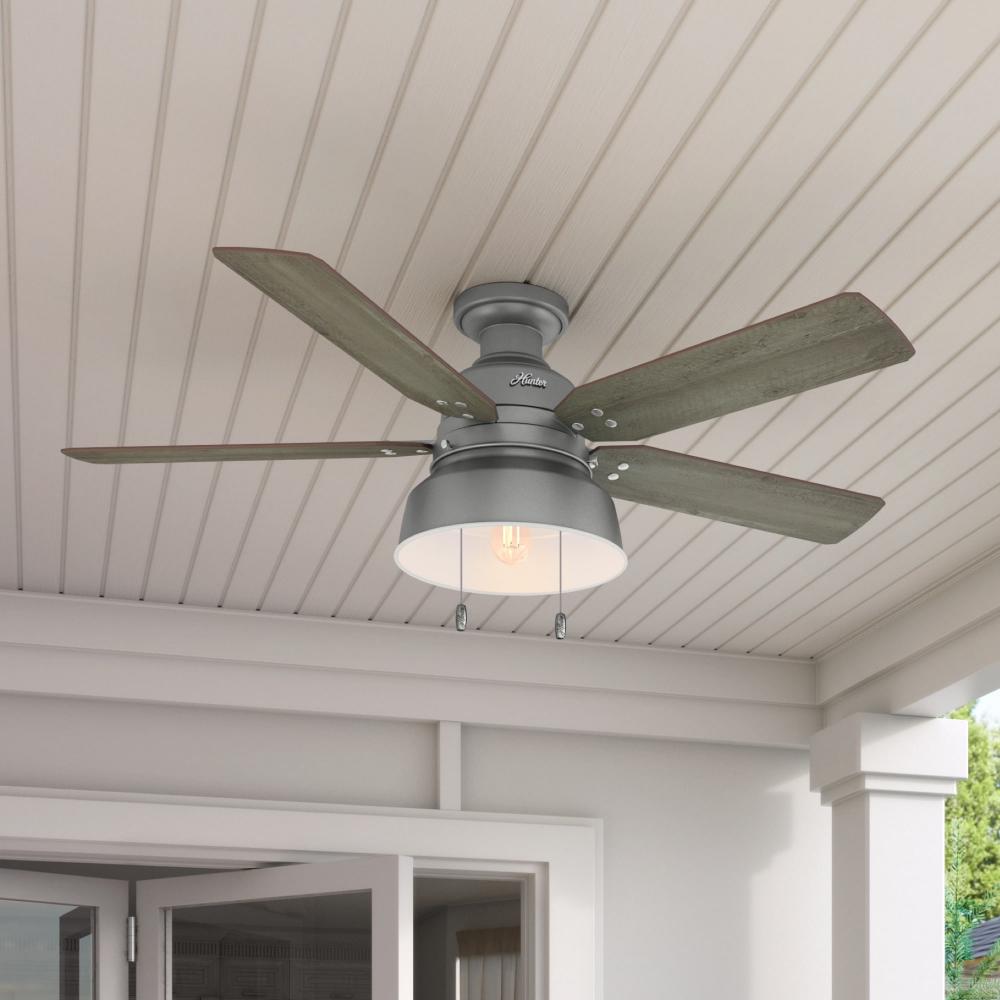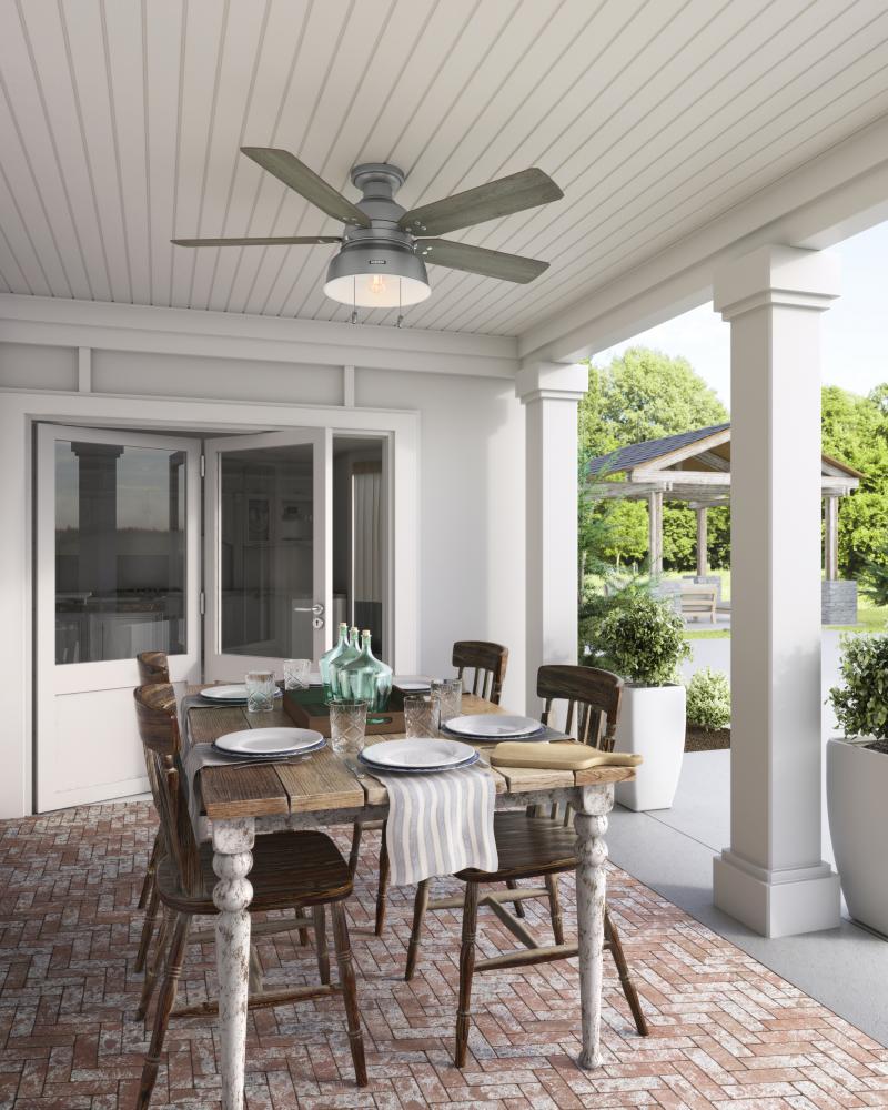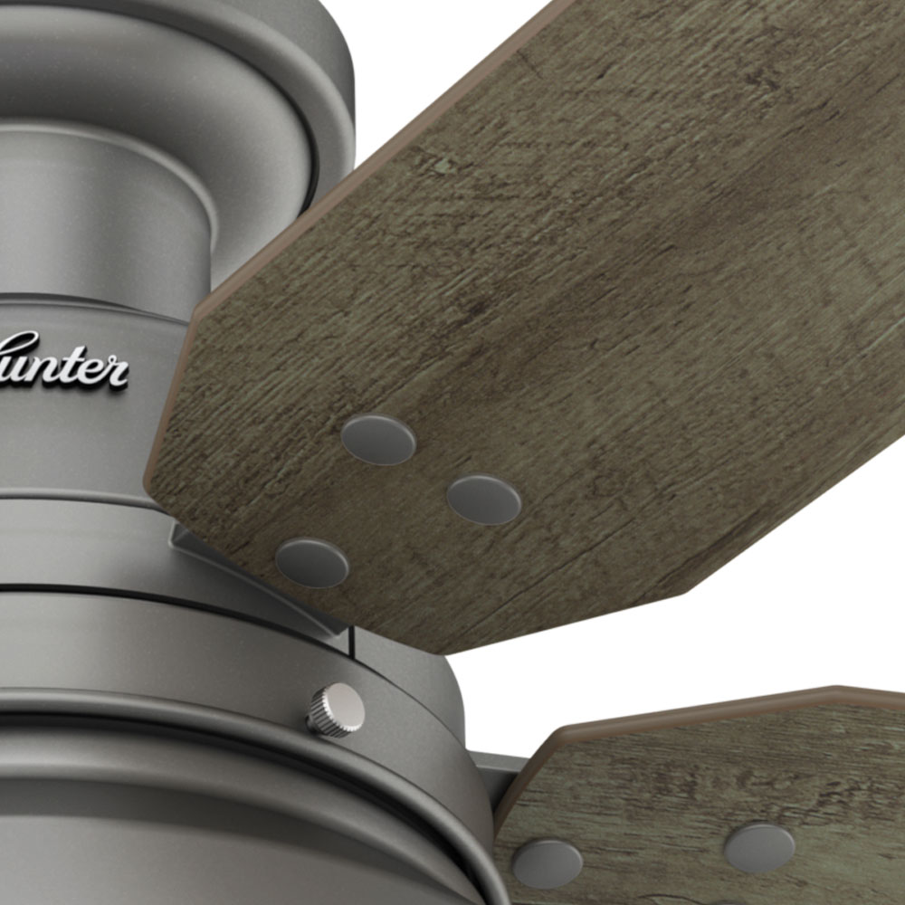 Industrial and rustic design come together on the Mill Valley low-profile ceiling fan with details including the vintage-looking rivets securing the blades, coin-edge thumbscrews, and barn-style open hood light. Style meets performance with the Mill Valley’s white hood reflector that maximizes light from a vintage-style energy-efficient LED Edison bulb. Perfect for areas exposed to moisture and humidity, this damp-rated fan completes the look of casual farmhouse living spaces or patios with low ceilings. The Mill Valley Collection is available in a variety of finishes and mounting options to customize the look of your room's rustic home decor while maintaining a consistent style throughout your home.