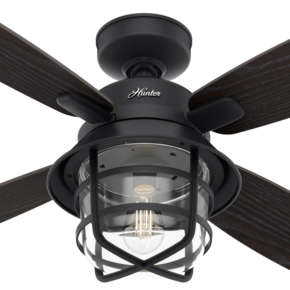 Rustic finishes and vintage details bring the Port Royale outdoor ceiling fan to life. The roasted maple blade finishes complement the lantern-inspired light fixture and energy-efficient LED Edison bulb. This farmhouse-inspired ceiling fan includes a handheld remote for easy changes to fan speed and light dimming. The damp rated Port Royale ceiling fan is perfect for covered porches and patios as well as indoor living rooms and bedrooms.