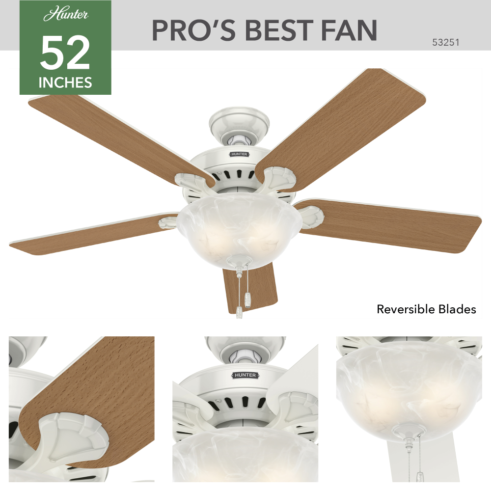 With three finishes and a 52-inch blade span, the Pro's Best traditional style will complement the classic look of the large rooms in your home. Featuring a reversible, three-speed WhisperWind? motor, this fan will deliver a quiet and ultra-powerful performance. The bowl light kit with two bulbs provides the perfect amount of light through a Florence glass bowl. With reduced hardware and pre-installed pieces, your Pro's Best ceiling fan installation will be a breeze.