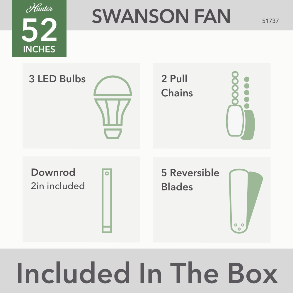 The 52-inch Swanson casual ceiling fan is an ideal fan for large rooms like bedrooms and living rooms. As a part of the Professional Series, the Swanson Collection is available in a variety of sizes, finishes, and light kit combinations. You can add this Hunter ceiling fan to every room in your home knowing it’s wobble free, whisper quiet, and long lasting.