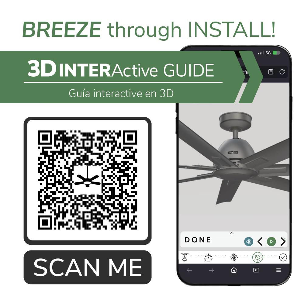 DIGITAL MANUAL: Installation made easy with Hunter’s 3D InterActive Guide—just scan the QR code for quick setup.