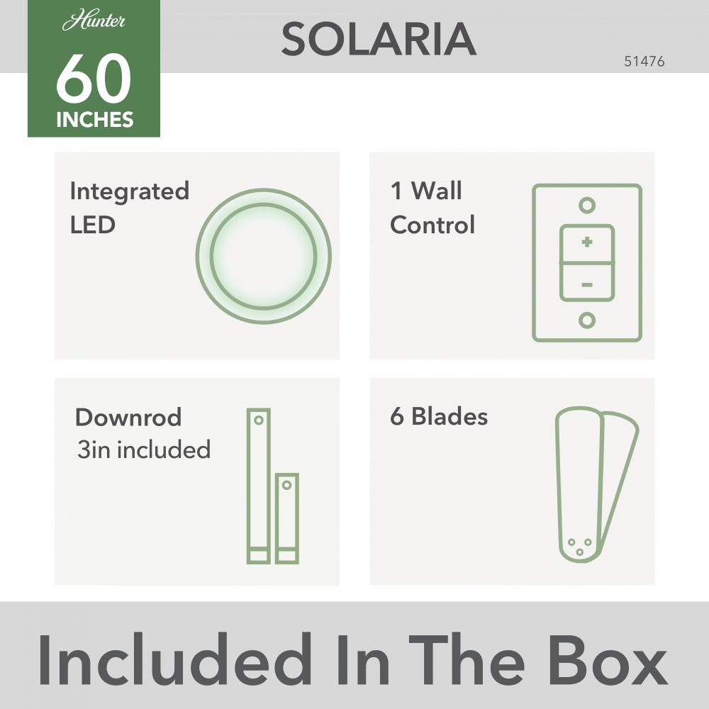 The Solaria outdoor ceiling fan features our exclusive SureSpeed® Guarantee, providing unrivaled high-speed cooling. As a Hunter ENERGY STAR® certified ceiling fan, the Solaria is 64% more efficient on average than conventional fans* while helping you save you money on cooling costs. This large ceiling fan is damp-rated for use in covered rooms exposed to moisture like porches, patios, garages, and bathrooms.