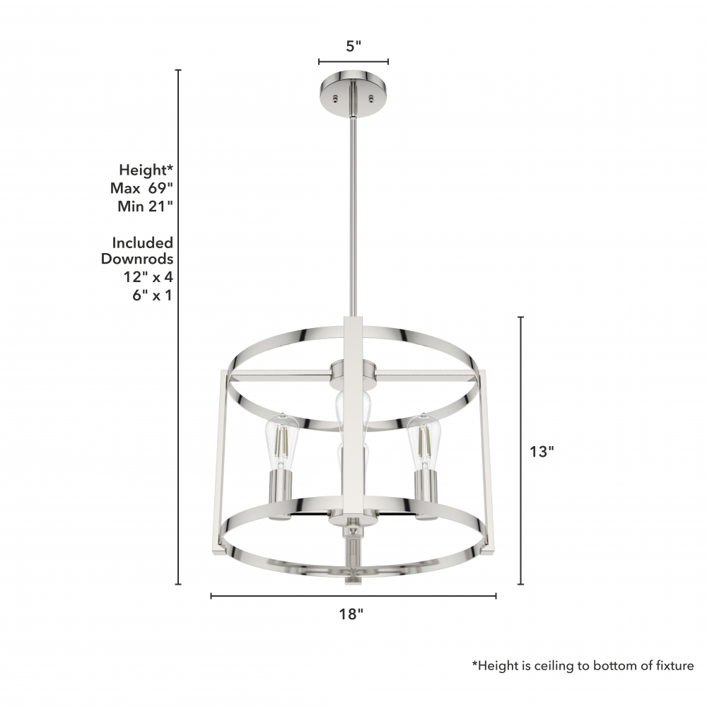 CUSTOMIZABLE HANGING OPTIONS: With the minimum required downrod, the hanging length is 21 inches. When using all of the included downrod, the maximum hanging length is 69 inches.