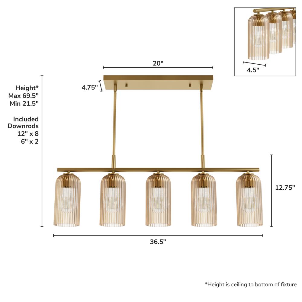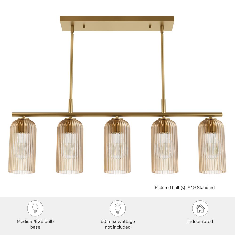 Brighten your culinary space with the stunning Beverly Glen 5 Linear Kitchen Island Chandelier from the Jasmine Roth Collection. Available in Luxe Gold or Matte Black finishes with amber or clear glass, this chandelier combines style and functionality. Its transitional design effortlessly merges classic elegance with modern sophistication, making it the perfect centerpiece for your kitchen island. Rated for indoor use, the Beverly Glen Chandelier casts a warm, inviting glow, transforming your kitchen into a chic and stylish space. Illuminate your culinary haven with this stunning and versatile fixture.