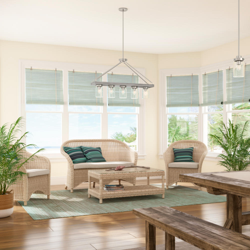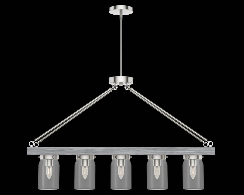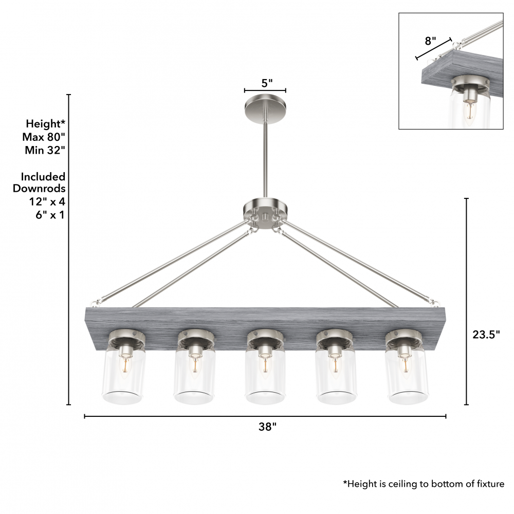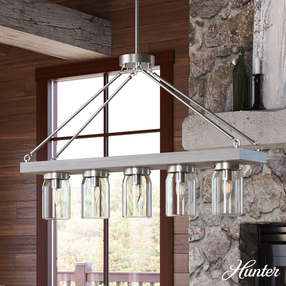 Vintage flair without the fuss. Simply stunning, the Devon Park 5-light linear chandelier’s rustic wood finishes and ball jar inspired glass shades create a look perfect for rustic and farmhouse style spaces. Pair with vintage LED Edison bulbs for an authentic, inviting look.