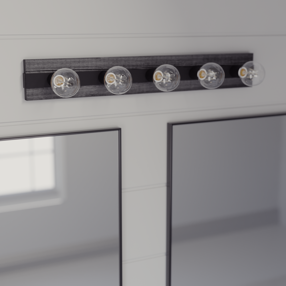 Strong details. Impactful design. The Donelson 5-light vanity light evokes authenticity and artisanship with beautiful, wood-inspired finishes accented by metal detailing. Add one above your bathroom vanity or use multiple to create your own unique Hollywood-style vanity mirror lighting.