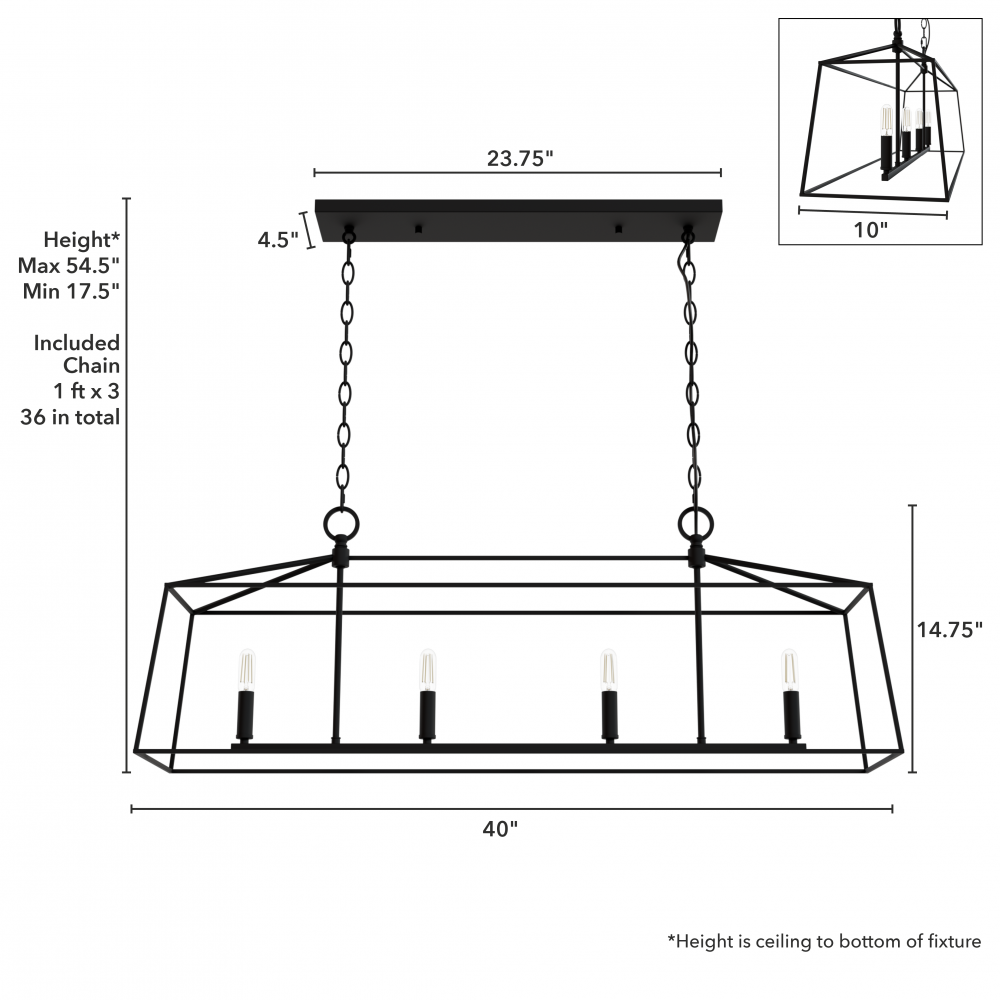 CUSTOMIZABLE HANGING OPTIONS: With the minimum required cord, the hanging length is 17.5 inches. When using all of the included extensions, the maximum hanging length is 54.5 inches.