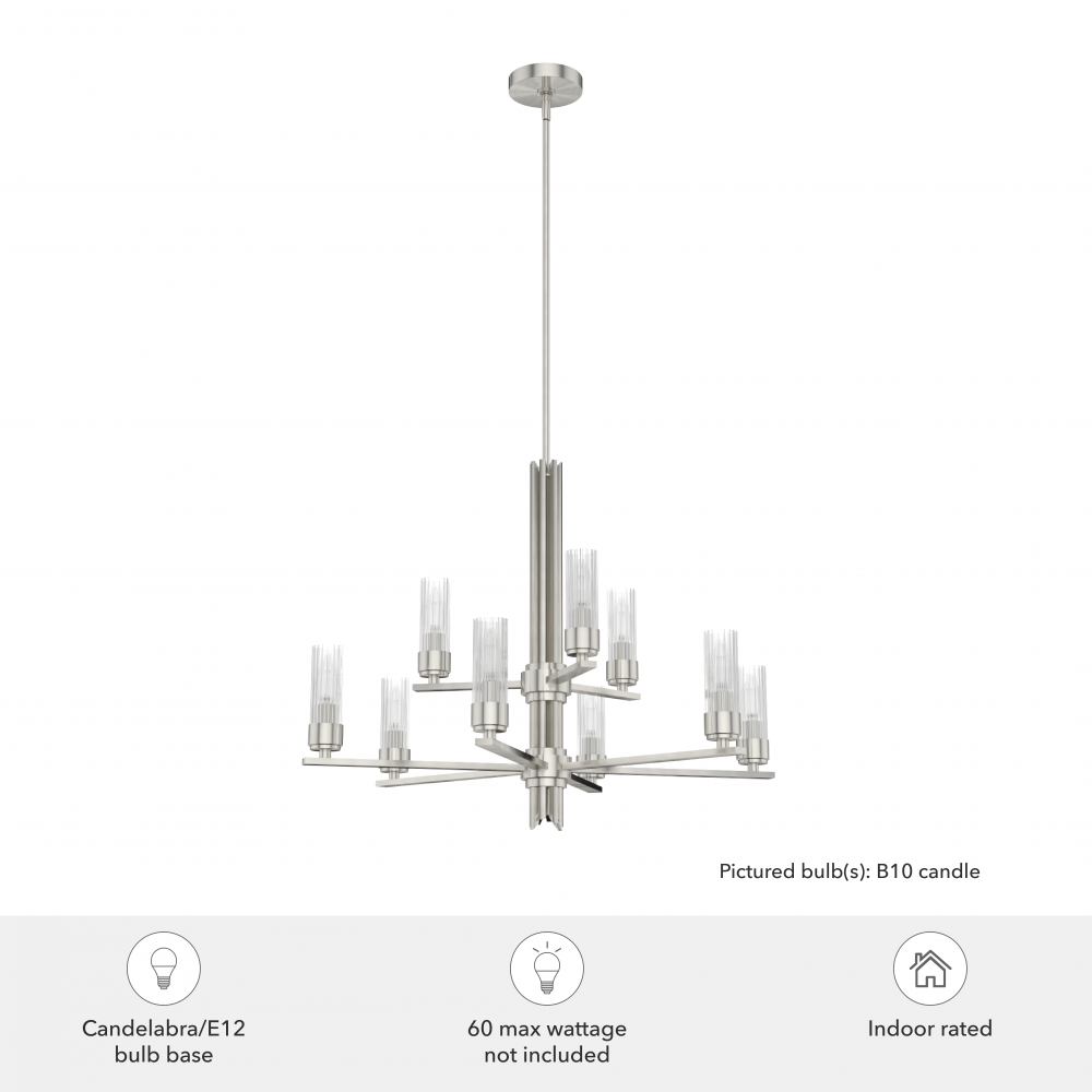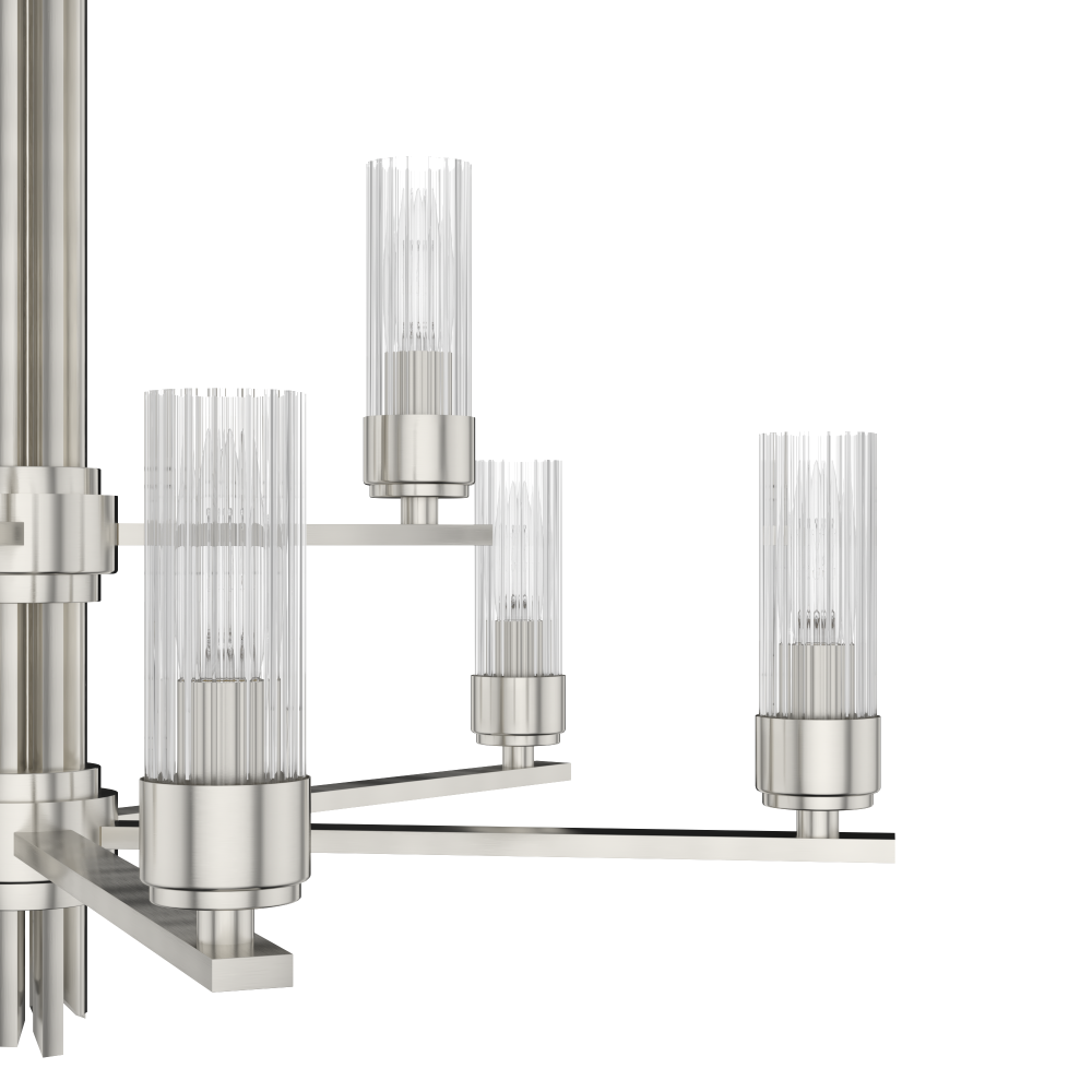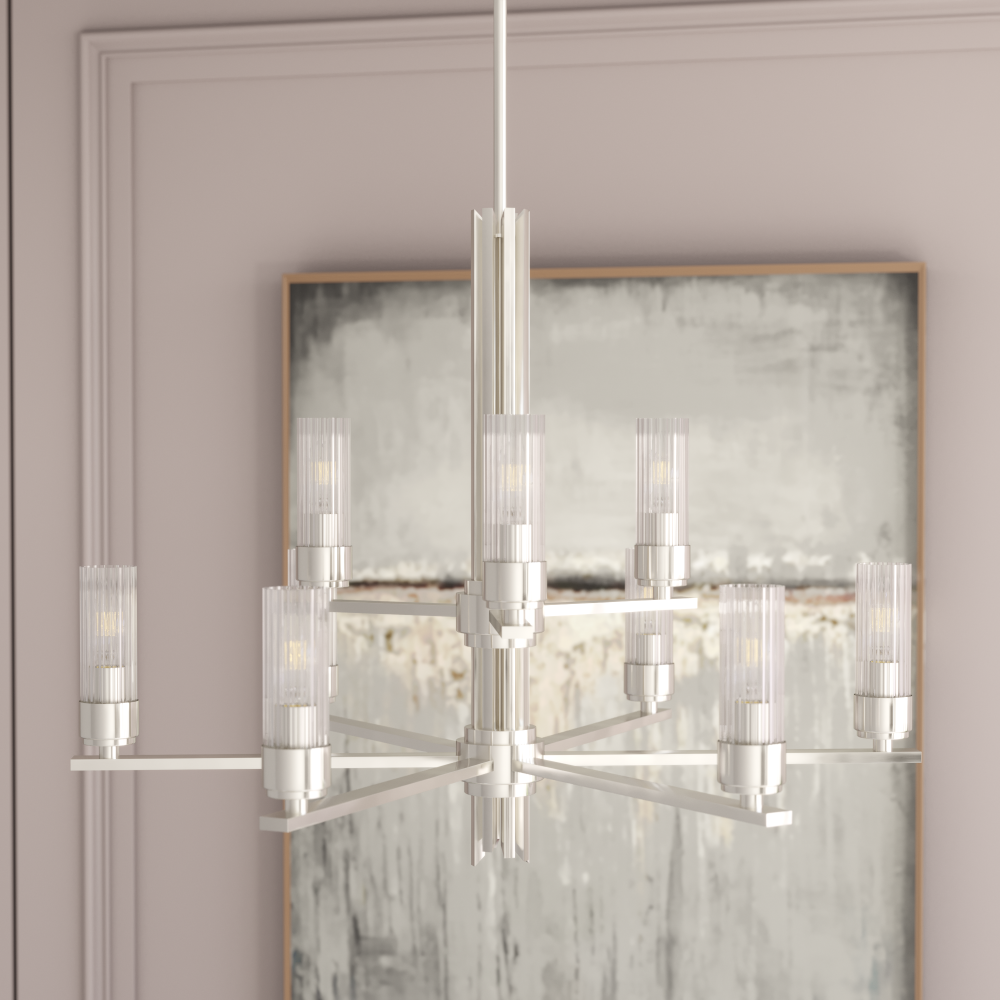 Create a sensation with the flick of a switch. The Gatz chandelier is the epitome of elegance and glamour. The multiple fluted glass shades and metal finish are lovely by day but stunning at night. You can add sparkle throughout your space with other lights from the collection.?Mix and match with other fixtures from this collection or from our ceiling fan designs.