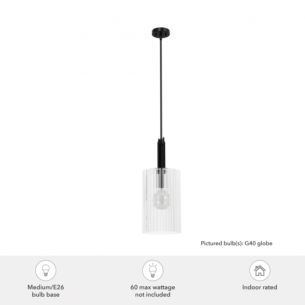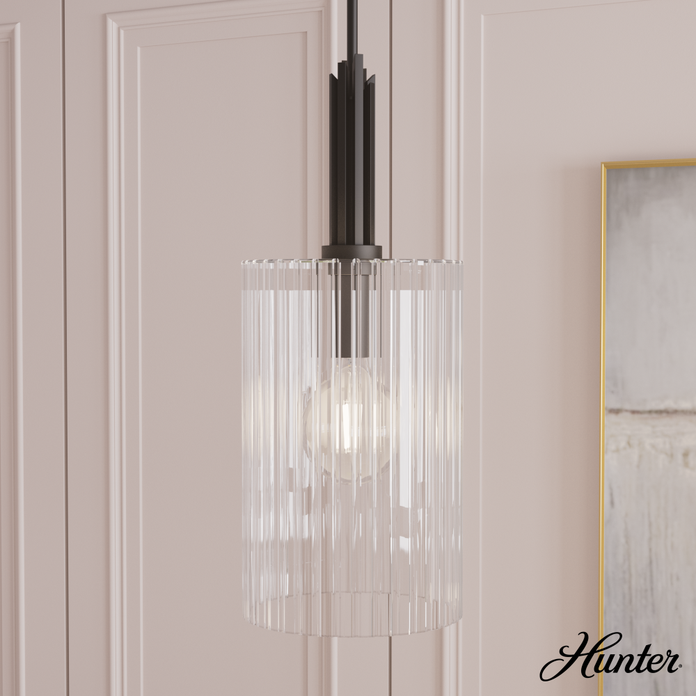 Hunter Gatz Matte Black with Clear Fluted Glass 1 Light Pendant Ceiling Light Fixture