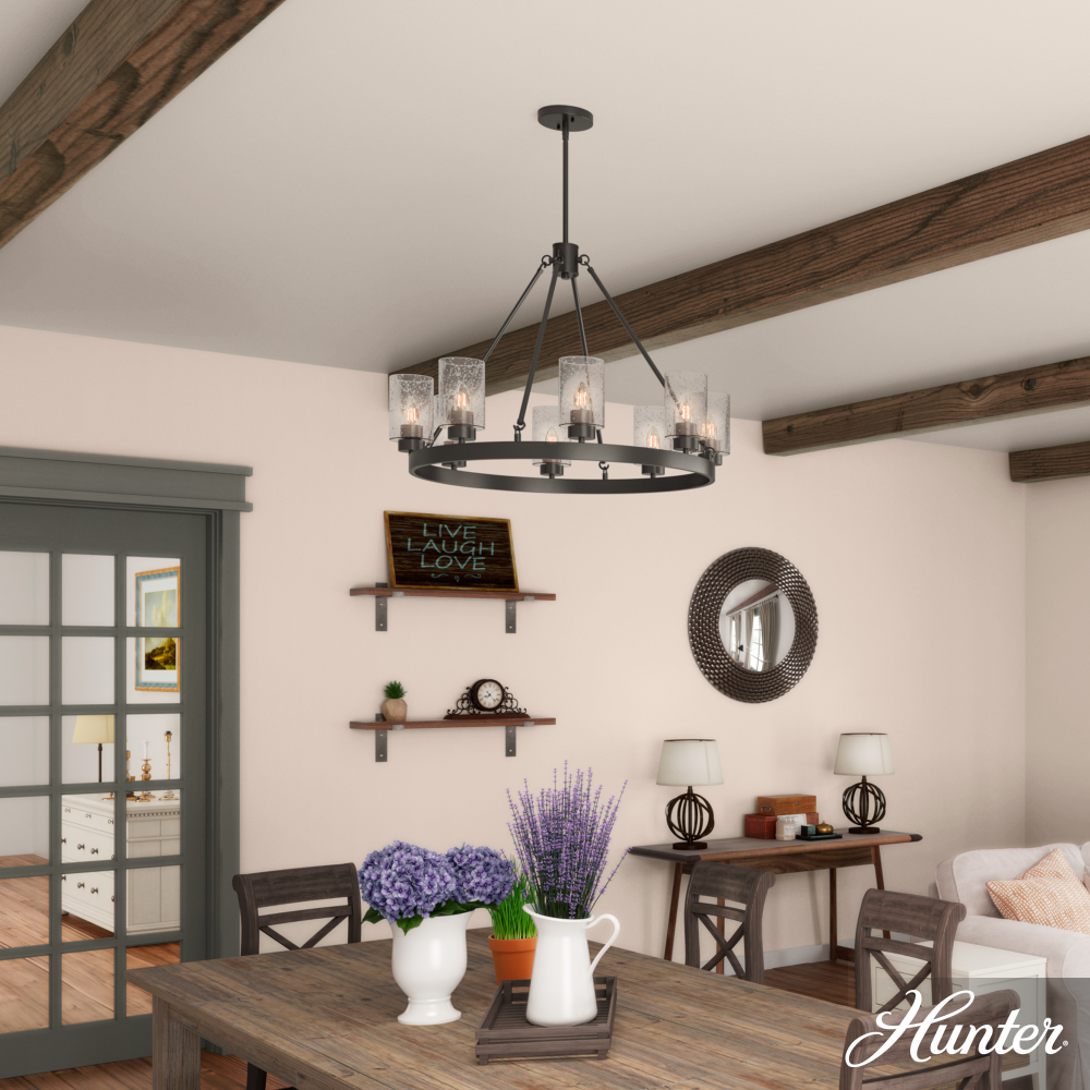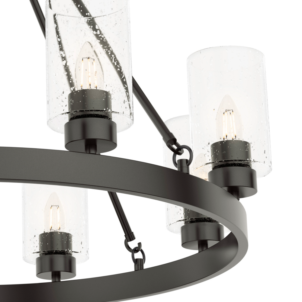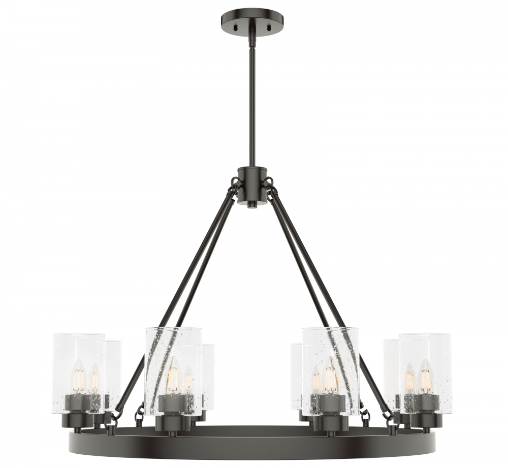 A revised classic design with statement-making elements. The Hartland round chandelier’s showcase feature is the clear seeded glass shades. Relish the way the glass catches the light and sparkles in a beautiful effect with this chandelier. The textured glass and strong lines in this round chandelier make for a perfect finishing touch to your space. Mix and match with other fixtures from this collection or from our ceiling fan designs.