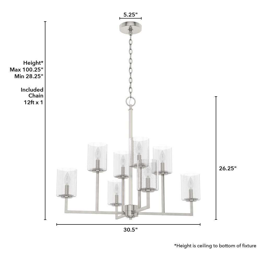 CUSTOMIZABLE HANGING OPTIONS: With the minimum required chain, the hanging length is 28.25 inches. When using all of the included chain, the maximum hanging length is 100.25 inches.