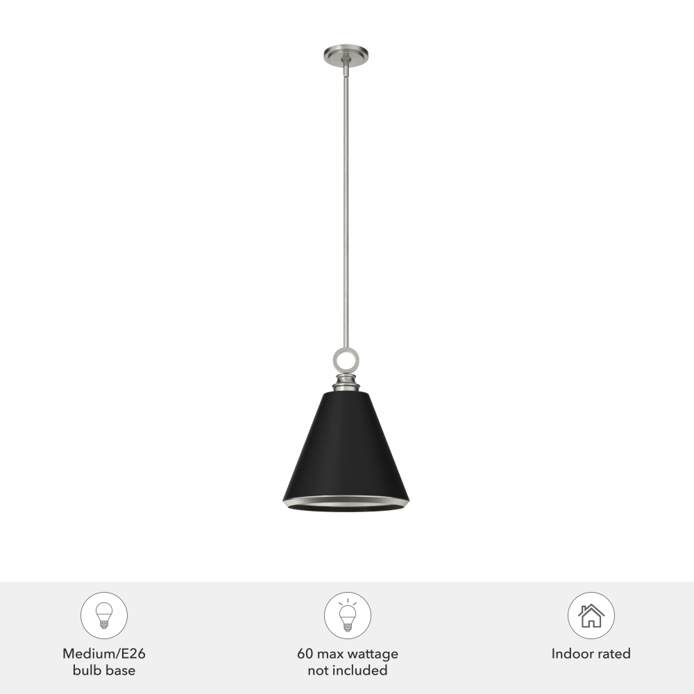 Suitable in any place where you entertain your guests will be 'wowed'. The Klein pendant makes a statement and creates a conversation at any party. The ring above the cone-shaped metal shade is the crowning piece of this sleek design. Make a modern statement with the Klein pendant light. Mix and match with other fixtures from this collection or from our ceiling fan designs.