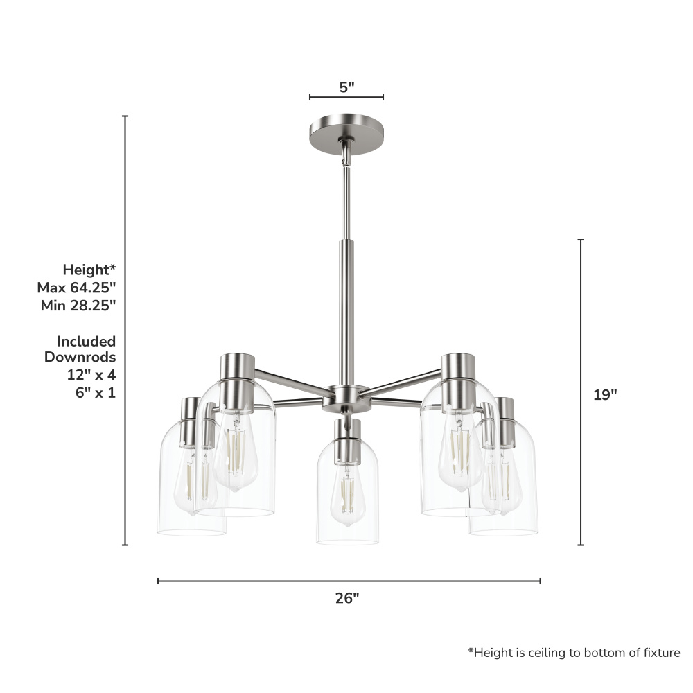 MINIMUM OVERALL HEIGHT: 28.25 inches. Maximum overall height, when all included downrods are used: 64.25 inches.