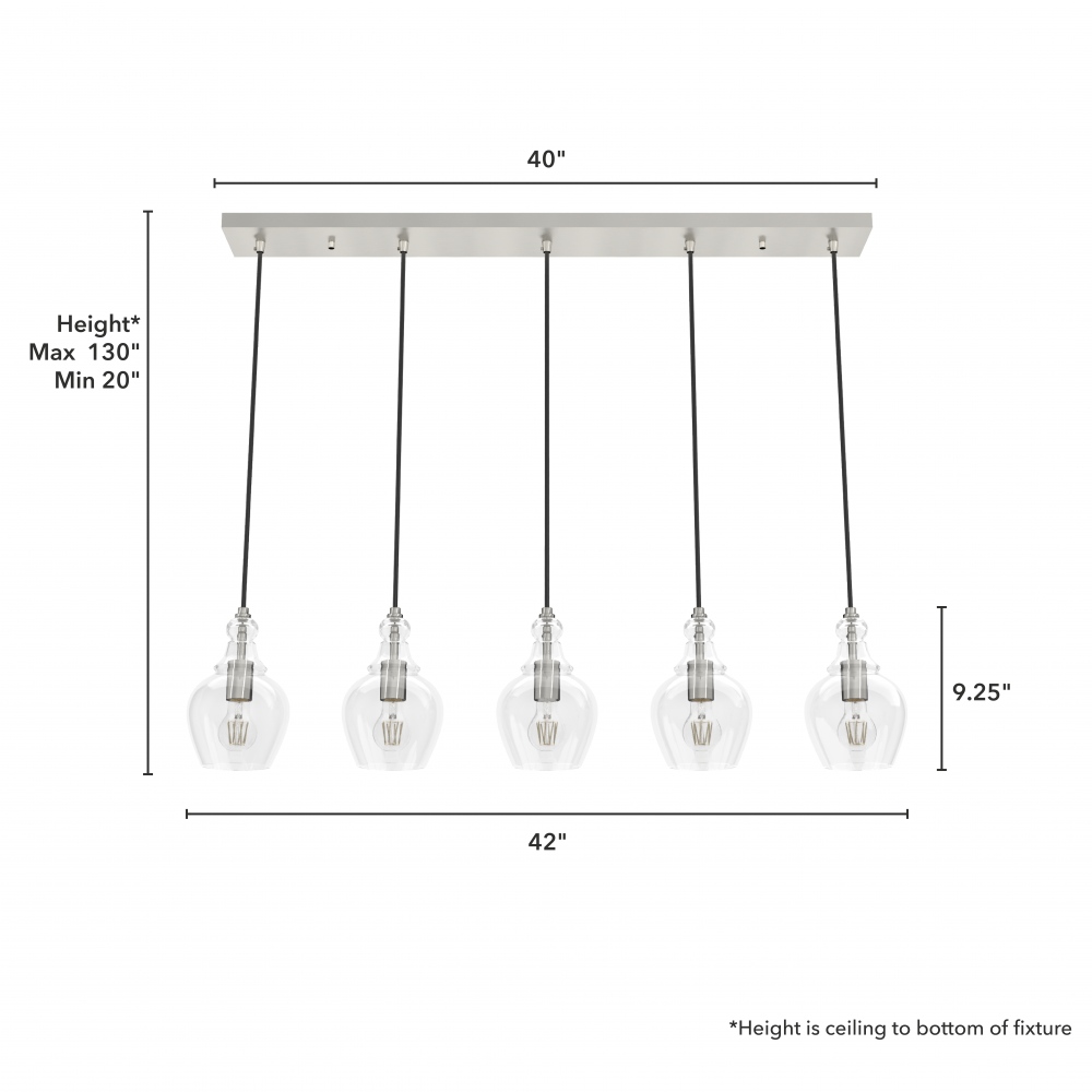 Illuminate your island or keep dinner conversations lit with the Maple Park linear cluster. Designed to evoke a farmhouse feel while seamlessly complementing a more modern aesthetic, this Maple Park fixture features five teardrop lights that bring the warmth closer to the action. Use vintage bulbs to round out the collection’s nod to the new traditional style. Mix and match with other fixtures from this collection or from our ceiling fan designs.
