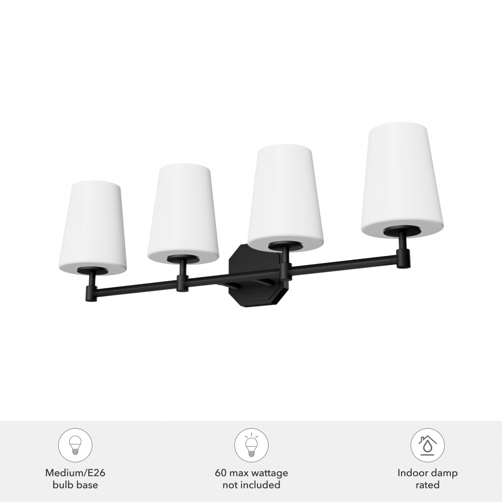 Hunter Nolita Matte Black with Cased White Glass 4 Light Bathroom Vanity Wall Light Fixture