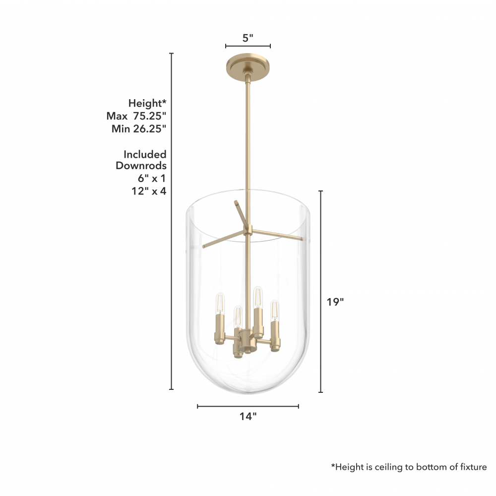 CUSTOMIZABLE HANGING OPTIONS: With the minimum required downrod, the hanging length is 26.25 inches. When using all of the included downrod, the maximum hanging length is 75.25 inches.