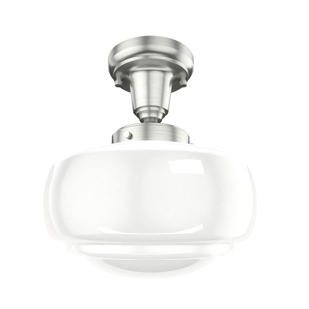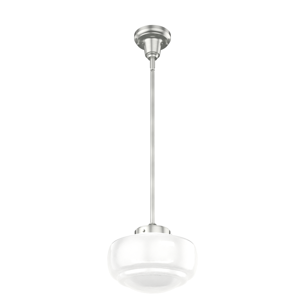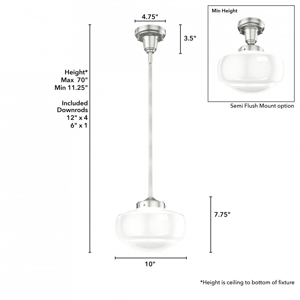 Traditional design. Elevated elements. The Saddle Creek mini pendant draws inspiration from the iconic American schoolhouse light but adds an updated touch with subtle detailing in the glass shade. For those who want all-in-one light fixtures, this schoolhouse-inspired mini pendant can also be installed as a semi-flush mount lighting.