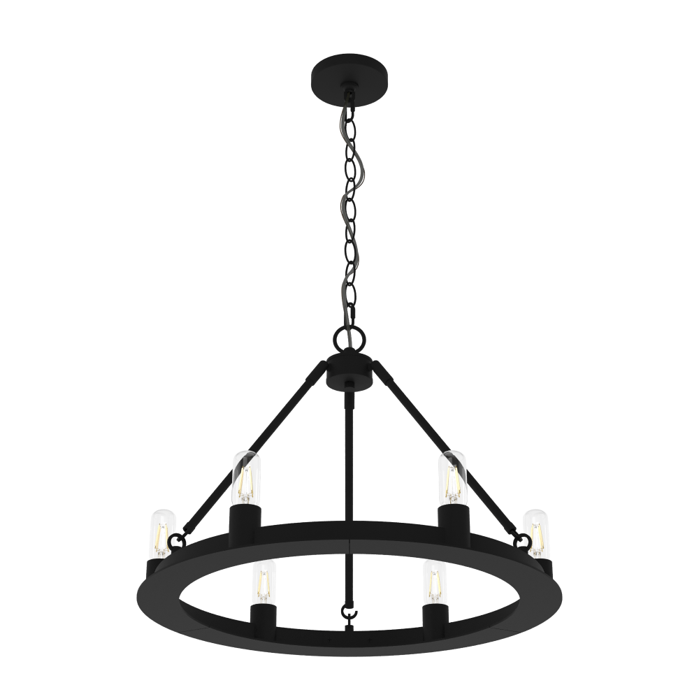 For small spaces that need big style, the Saddlewood round chandelier fits the bill. The simple yet bold design of the Saddlewood round chandelier makes it the perfect statement piece in modern industrial and farmhouse spaces. Add your own personal touch to this 6-light chandelier with the bulb style you choose.
