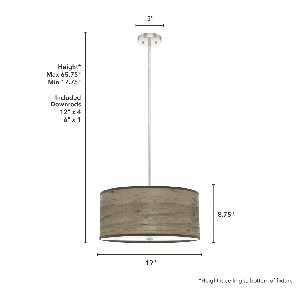 CUSTOMIZABLE HANGING OPTIONS: With the minimum required downrod, the hanging length is 17.75 inches. When using all of the included downrod, the maximum hanging length is 65.75 inches.
