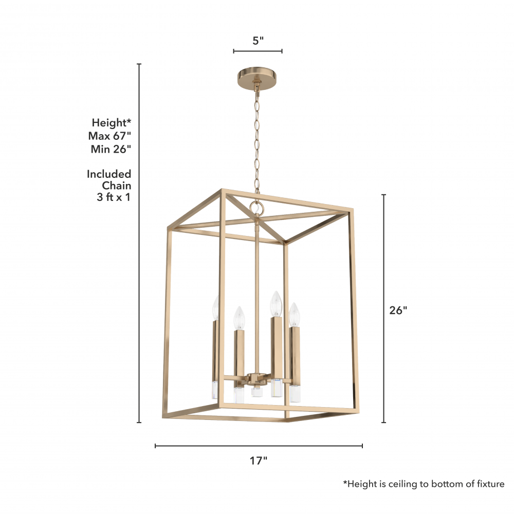 CUSTOMIZABLE HANGING OPTIONS: With the minimum required chain, the hanging length is 26 inches. When using all of the included chain, the maximum hanging length is 67 inches.
