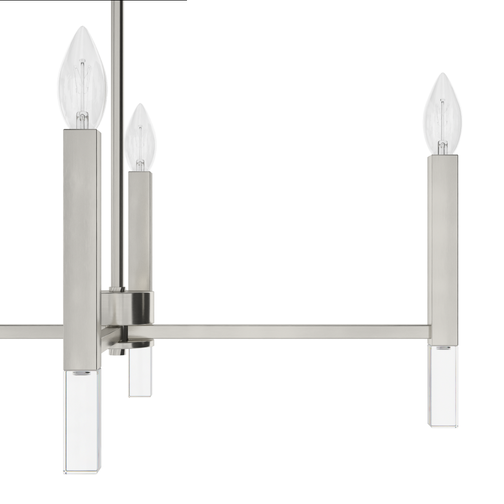 Gathering under the glow of the Sunjai linear chandelier will turn your dinner into a party. Laugh and dine under this beautiful modern fixture perfect for kitchens and dining rooms. This chandelier is modern and meets glamourous with geometric adornments set into the clean-lined metal candles to add a touch of sparkle that will compliment any decor. Mix and match with other fixtures from this collection or from our ceiling fan designs.