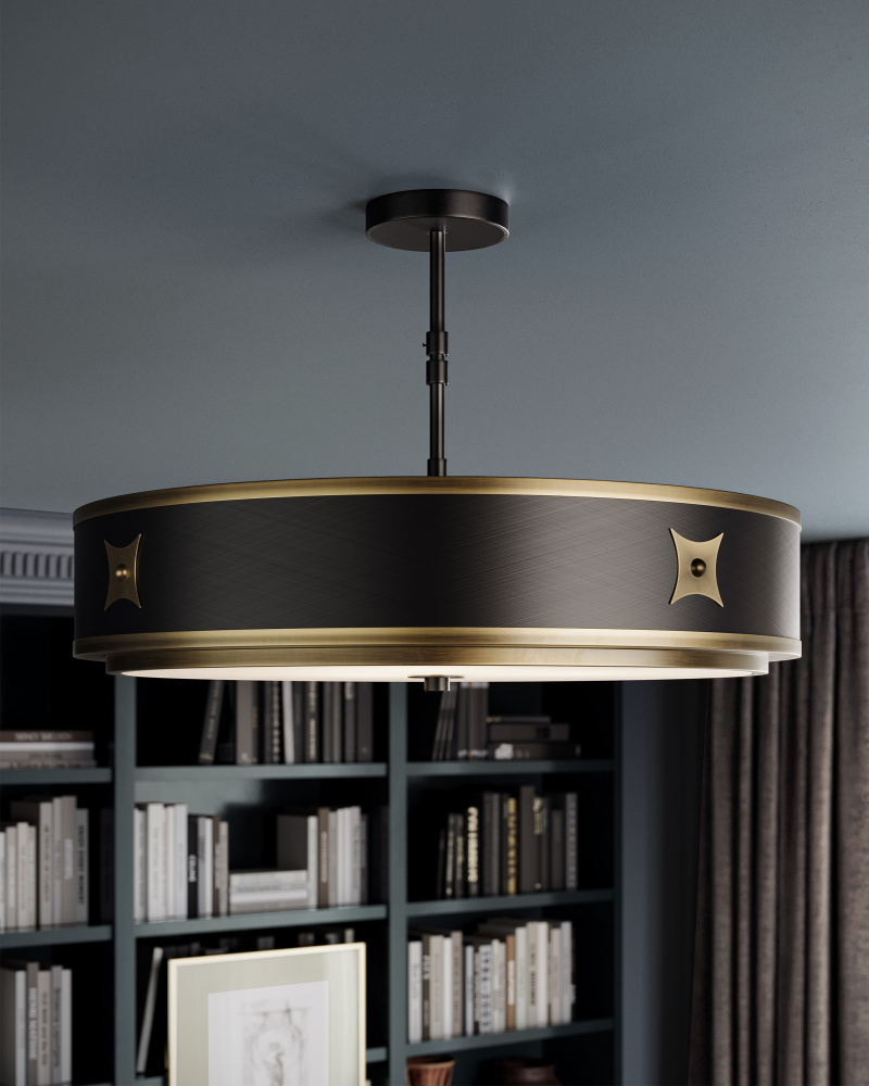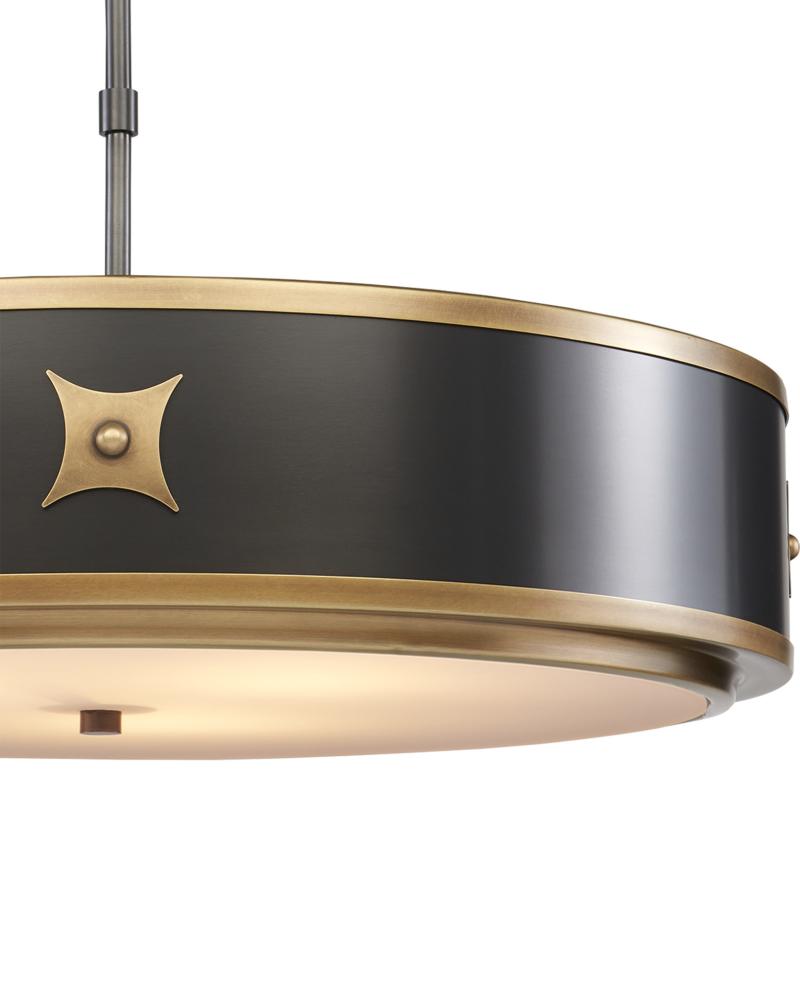Design notes that make the Huntsman Pendant special include the narrow drum shape of the shade, the satin black and contrasting antique brass finishes, the lines of gold on the exterior of the shade, and the decorative medallions adorning the black pendant.