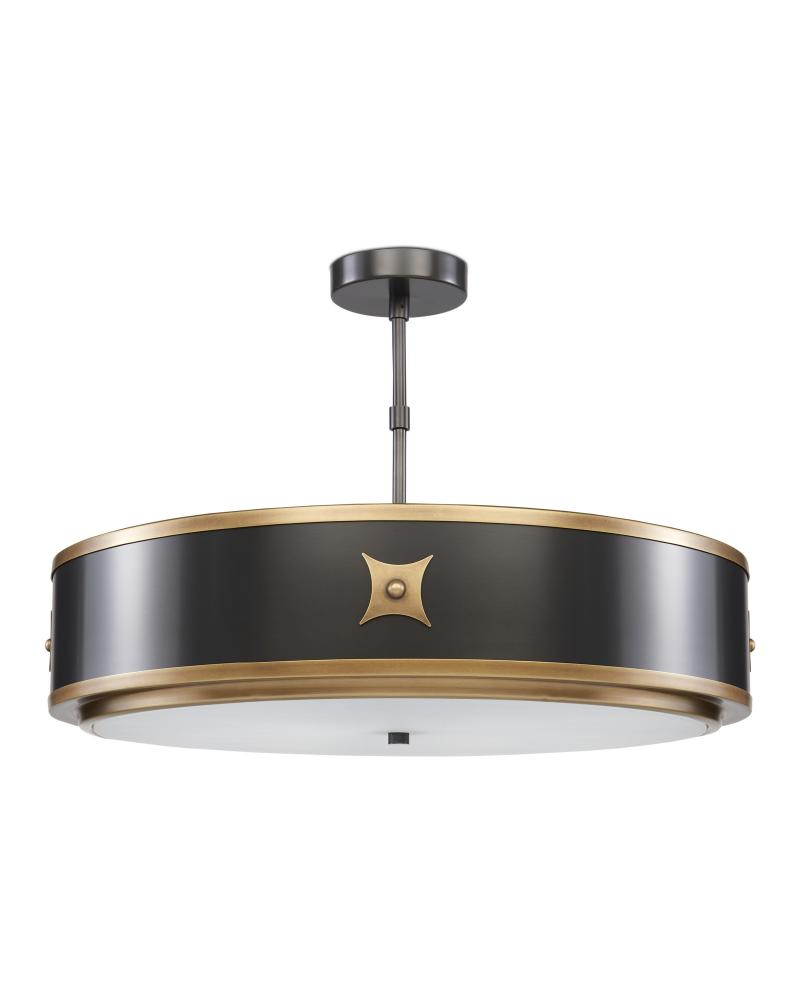 The sophistication of the banding is a hallmark of the Huntsman series. With the oval shapes of the chandelier and lantern, it’s the alternating satin brass and antique brass finishes on the whorling bands that set them apart; with the narrow drum shape of the Huntsman Semi-Flush Mount, it is the way the satin black is edged in contrasting antique brass. Lovely lines of gold on the exterior of the shade echo the finish on the rim holding the diffuser and the decorative accents, all coalescing to bring this three-light fixture its charm.