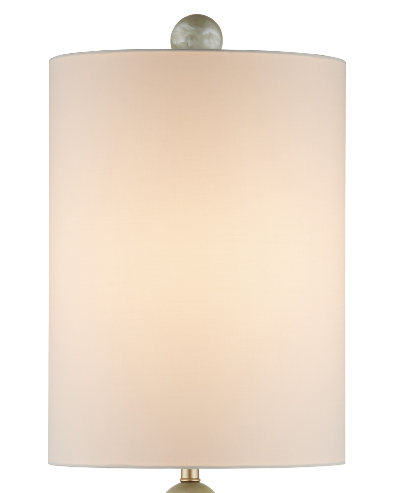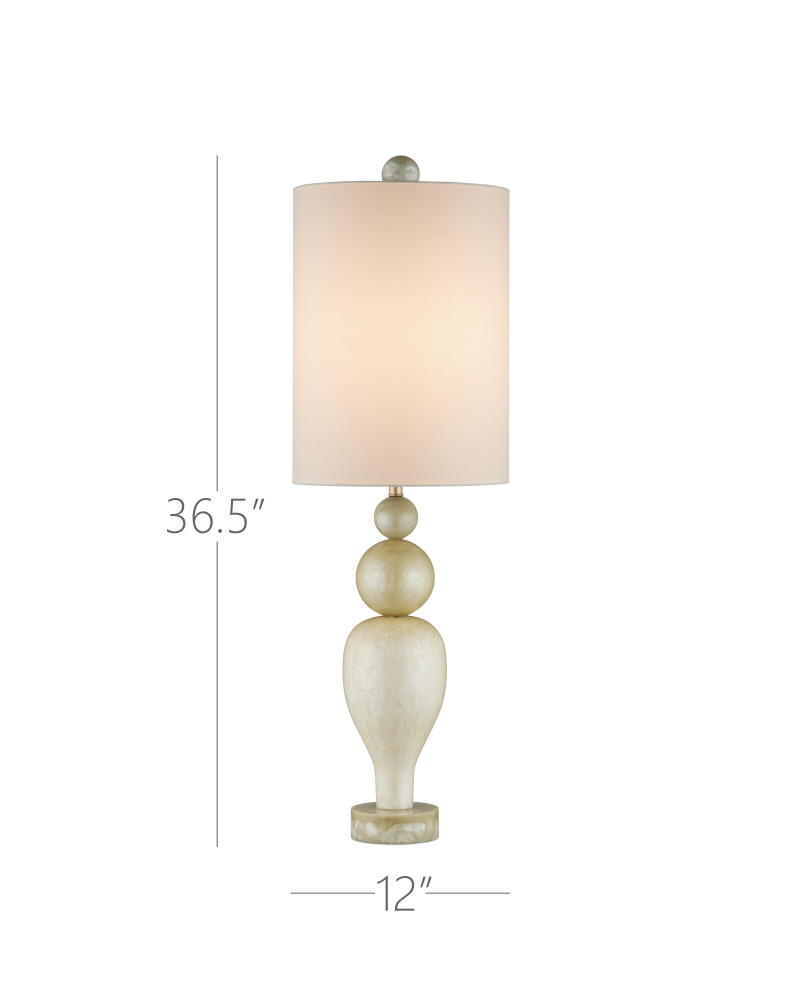 The Hutson Table Lamp is a Milano-inspired design made of composite finished with a pearlescent powders to bring added sheen to the surface of the three round shapes that graduate in color from lighter to darker as the geometric forms rise toward the shade. Sitting atop a disc-shaped base and topped with a very tall shade, the lamp is a great choice for console tables or buffets, as it is 37 inches tall but is only a foot in diameter.