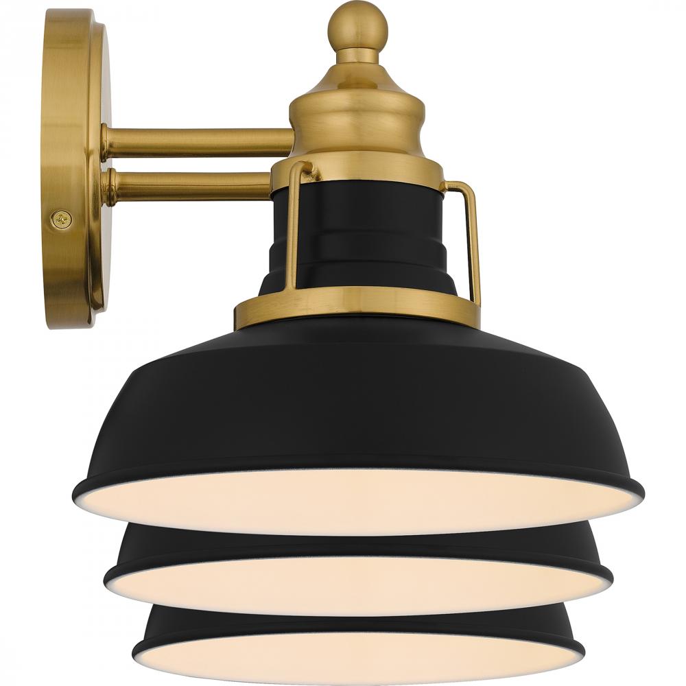 The traditional style of the Huxley bath light collection features elements of industrial design. Matte black metal shades are accentuated by an aged brass finish for a classic black and gold pairing. Choose from a variety of size options in this versatile