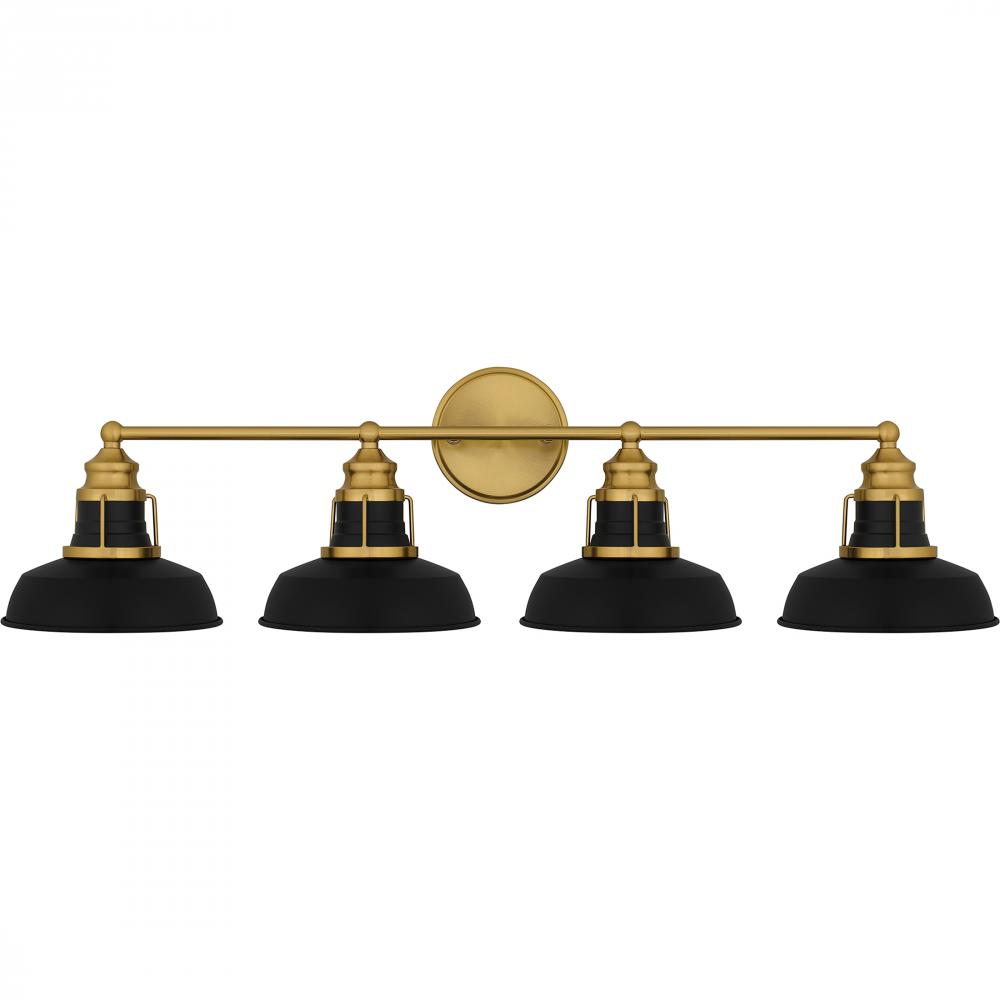 The traditional style of the Huxley bath light collection features elements of industrial design. Matte black metal shades are accentuated by an aged brass finish for a classic black and gold pairing. Choose from a variety of size options in this versatile