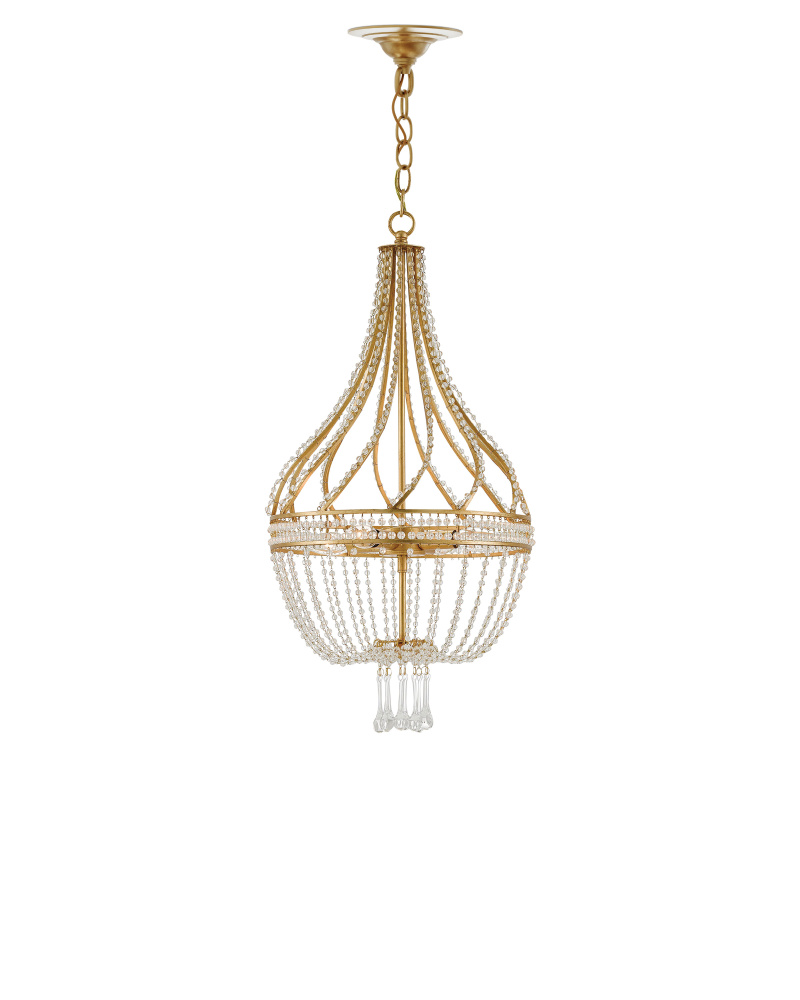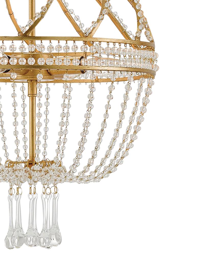 Dazzling strands of beaded crystals swirl about the upper half of our Ingenue Gold Chandelier. These shapely crystal drops and swags seem heavier than the beads dangling below. An antique gold leaf finish enlivens the classic empire style chandelier. Adjustable from 33" to 102" with use of included chain/rod kit/cable. If your space calls for a longer drop, additional chain/rods/cable is available for purchase.