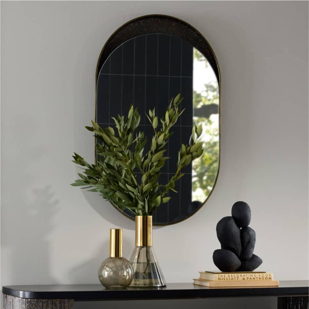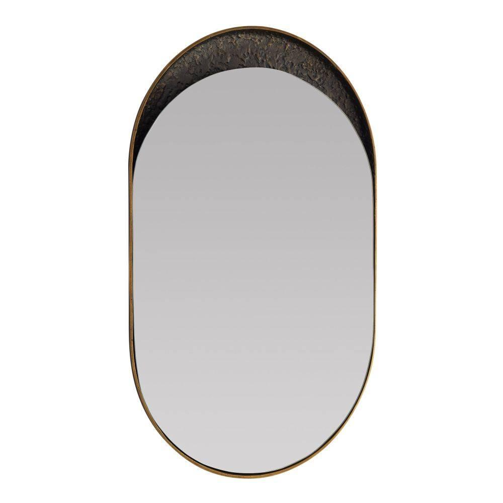 Playing with the concept of filled and unfilled forms, the Inset wall mirror's smooth glossy surface is set within a deeply textured, bronze-plated aluminum form as if it were being poured into a void. The offset, antique brass plated aluminum pill shaped elements create a sense of sliding motion, making the mirror a uniquely modern, dynamic choice for interiors of all kinds. The Inset mirror can be hung vertically or horizontally to create unique compositions. Finished with a cleat at the back for security. Finish will vary.