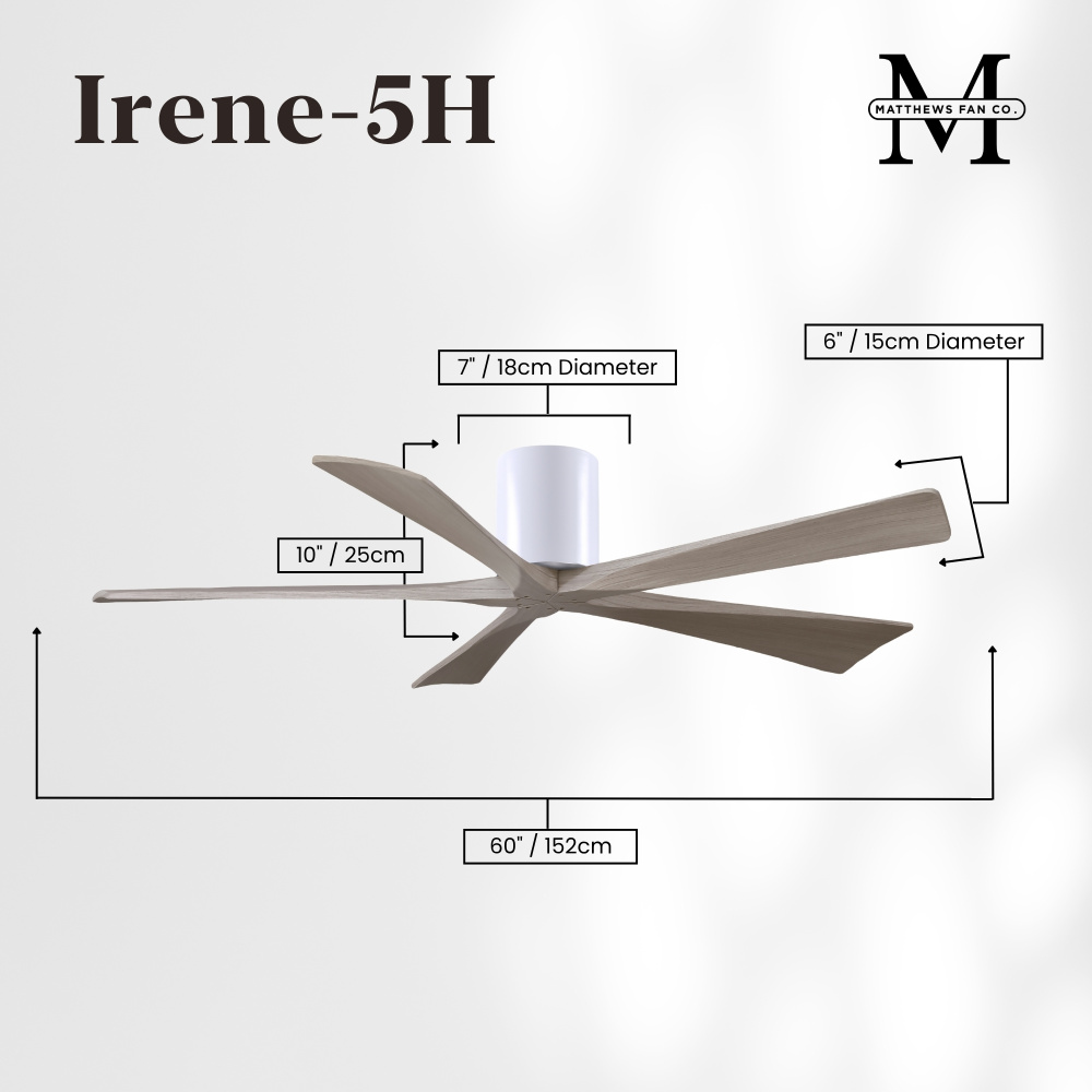 Irene-5H - 60" Five Blade Flush Mount Paddle Fan - Gloss White Finish - Gray Ash Tone Blades