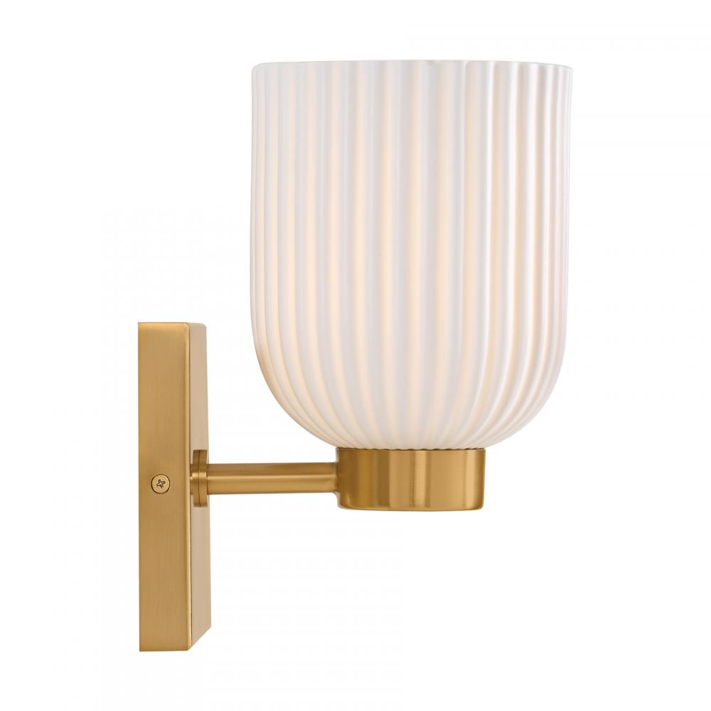 The Savoy House Isla Blanca 1-light sconce was designed by Breegan Jane, an award-winning interior designer and TV host. Breegan believes that luxe design is in the details, like the beautifully textured translucent porcelain shade that takes the spotlight here. When the light is on, the shade creates a flattering glow. When the light is off, it adds an eye-catching touch to any room. The Warm Brass finish amplifies the glamour. Isla Blanca is 9" in height, 5" in width and extends 6.5" from the wall. Uses one standard size bulb of up to 60 watts. The bulb is not included.