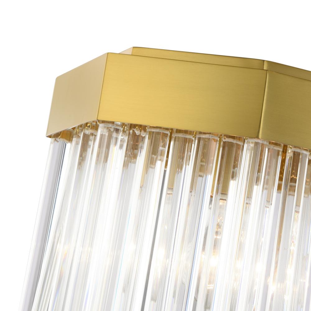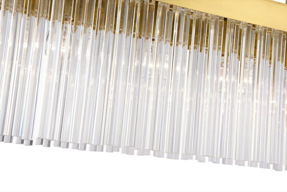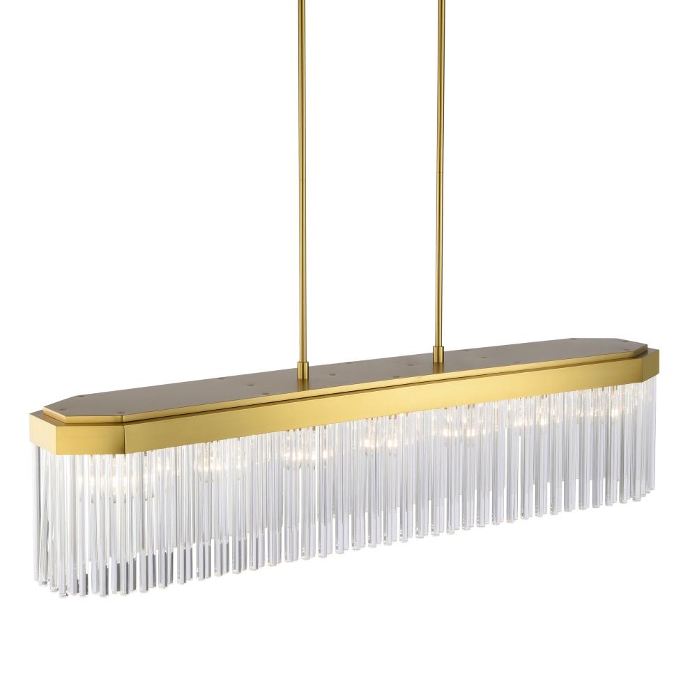 The linear chandelier from the Emma collection by designer Kevin Kraemer is a captivating blend of elegance and geometry. Individual glass rods, delicately suspended from a brushed brass hexagonal frame, shimmer with timeless sophistication, creating a mesmerizing interplay of light. Complemented by a matching hexagonal canopy, this design brings an air of modern luxury to any space. A perfect addition to any dining room with rectangular table or perhaps in a kitchen over an island.