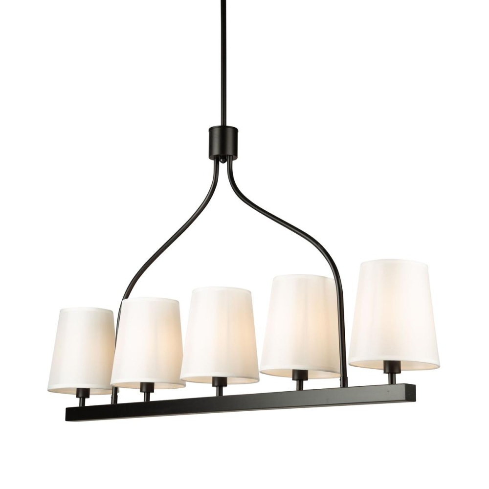 From the S&C design firm, with strict direction from Steven Sabados, the Rhythm Collection island lightfeatures a traditional type frame with flat tubular arms. The frame is finished in matte black and complimented with linen hardback white shades.