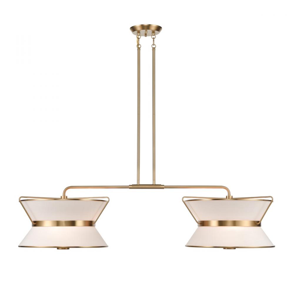 The Layla collection, designed by Kevin Kraemer, features a rich plated brushed brass finished frame, which holds the double linen shades in a unique fashion. This model is a linear island fixture, which comes with extra rods for height adjustment and compatible with sloped ceilings. Great for a kitchen island, or rectangular/oval table.