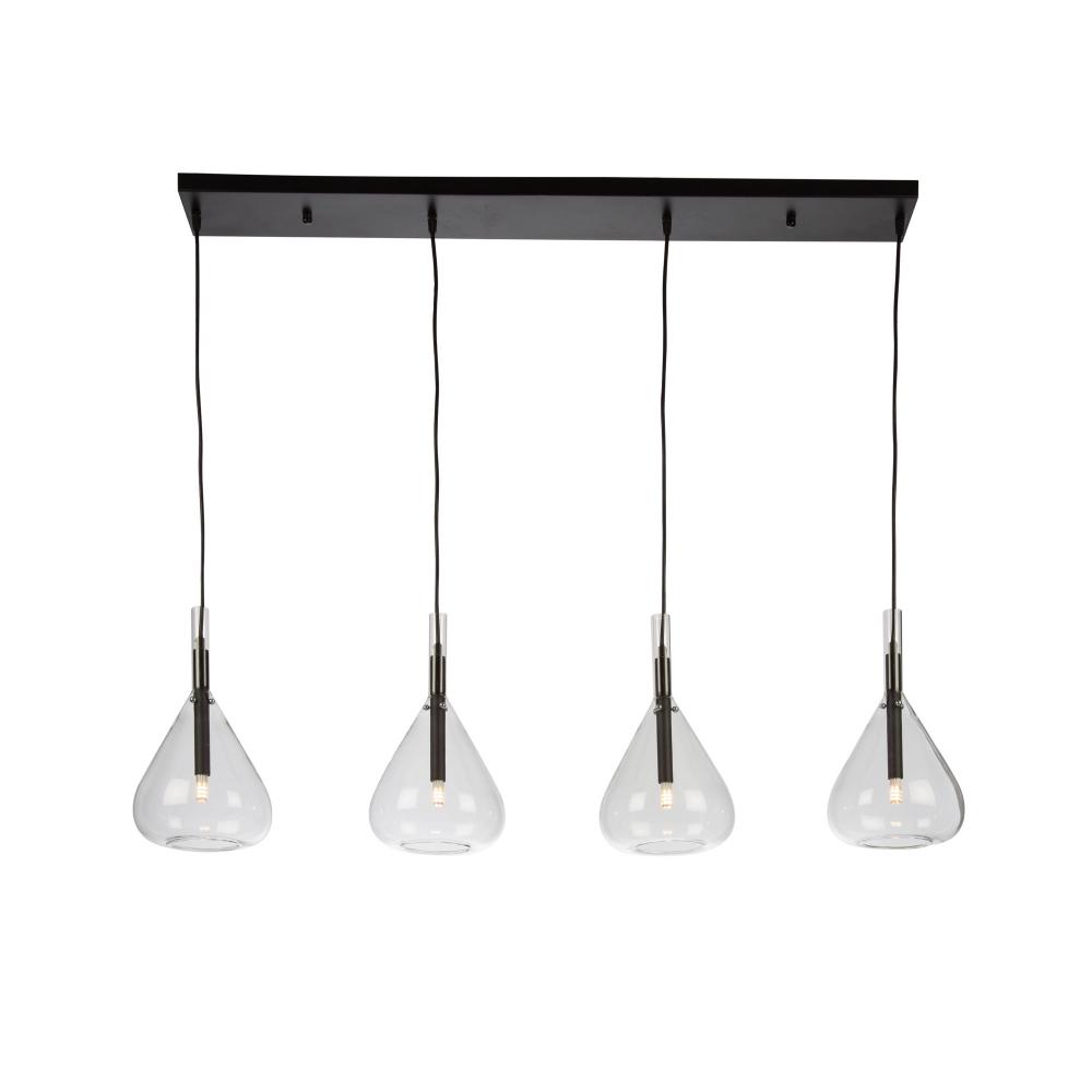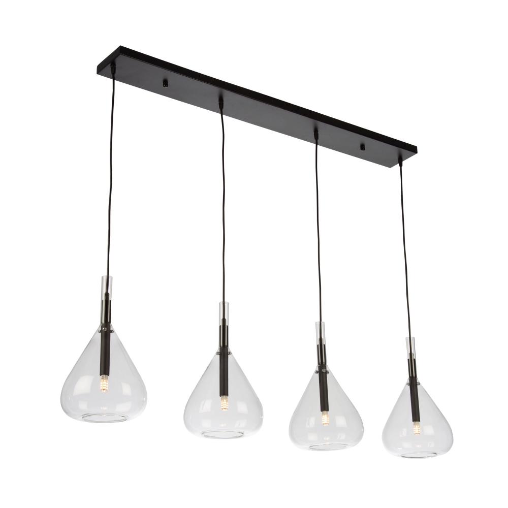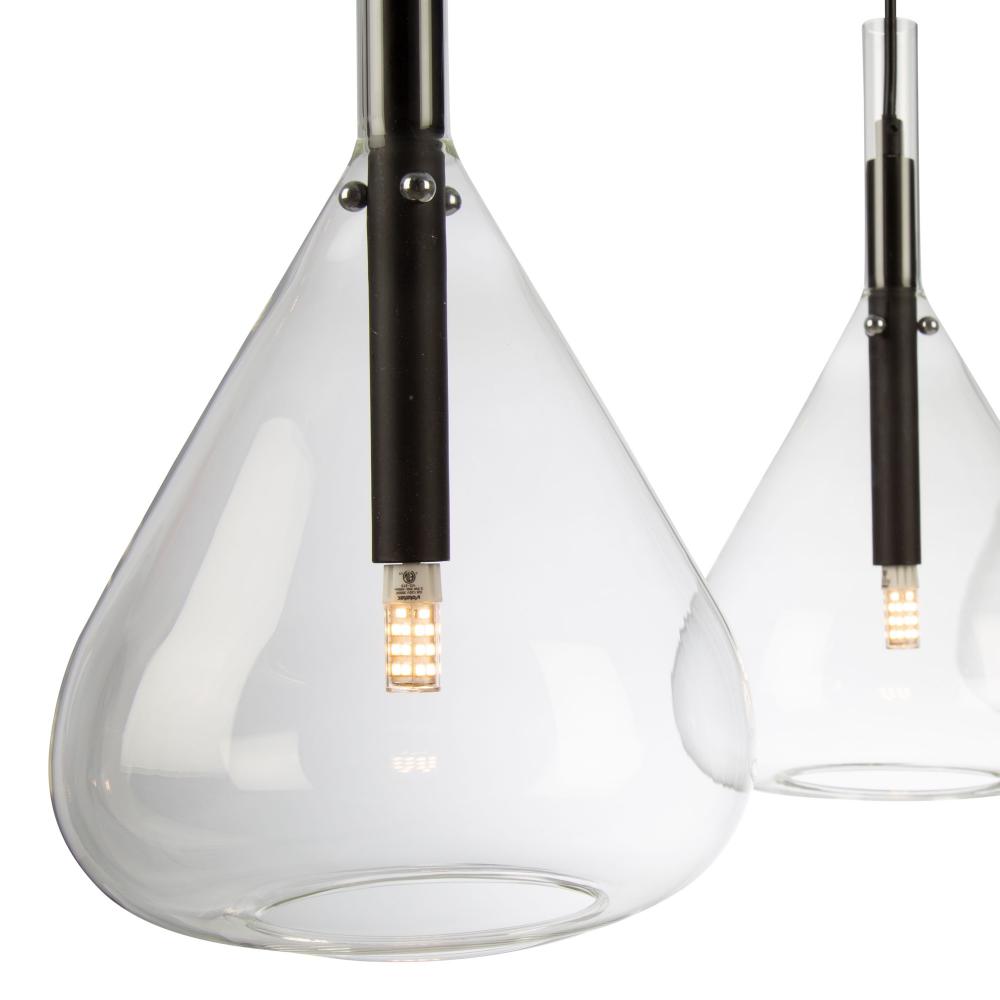 The Conic collection features a uniquely shaped glass design suspended on black frames. The glass is suspended by 3 nickel bullets to give it a floating effect. The bottom of the glass is open for each access to the bulbs. To finish off the design, the wiring has black textile covering.