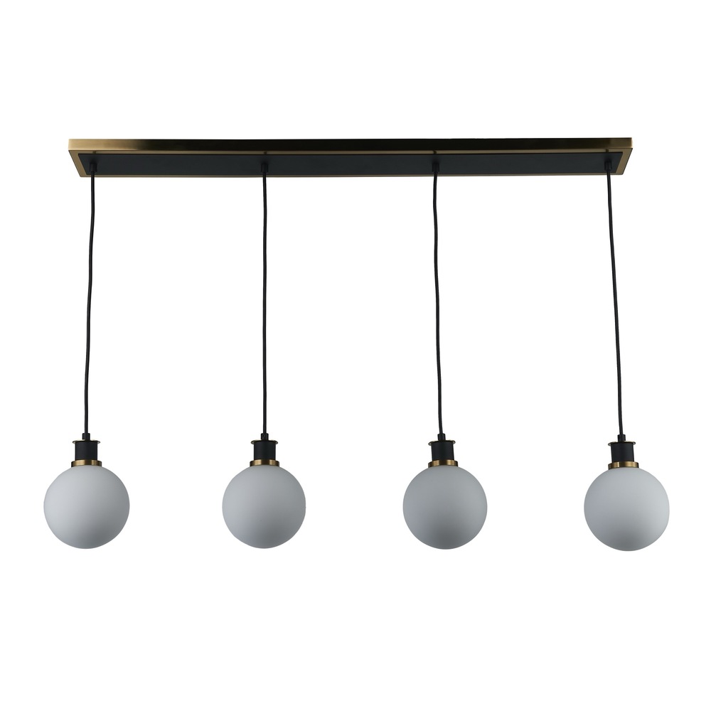 The Gem collection with acid white glass, also known as etched glass, is a type of glass that has undergone a process to give it a rich cloudy white appearance. When illuminated this glassware has a warm hue, which compliments its two-tone black and brushed brass framing. This model is the linear island 4 lite chandelier.
