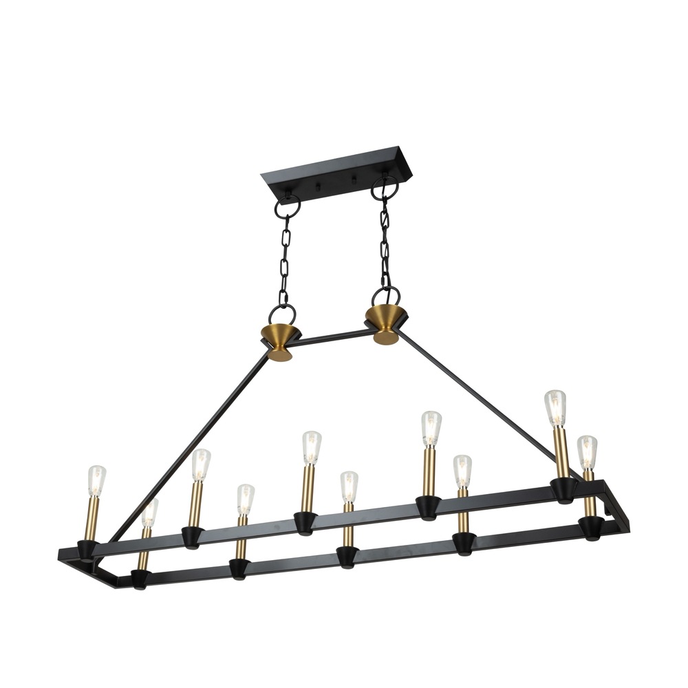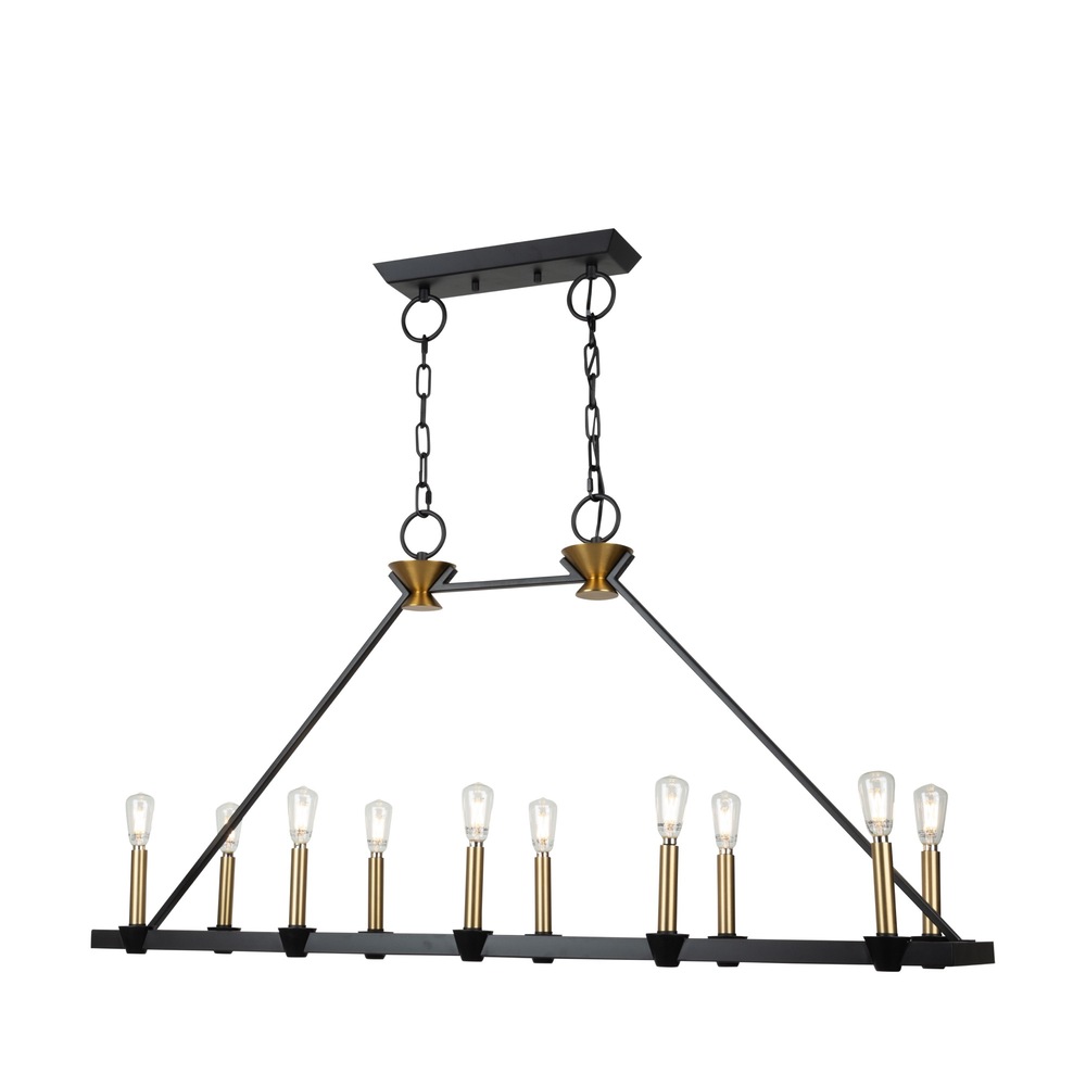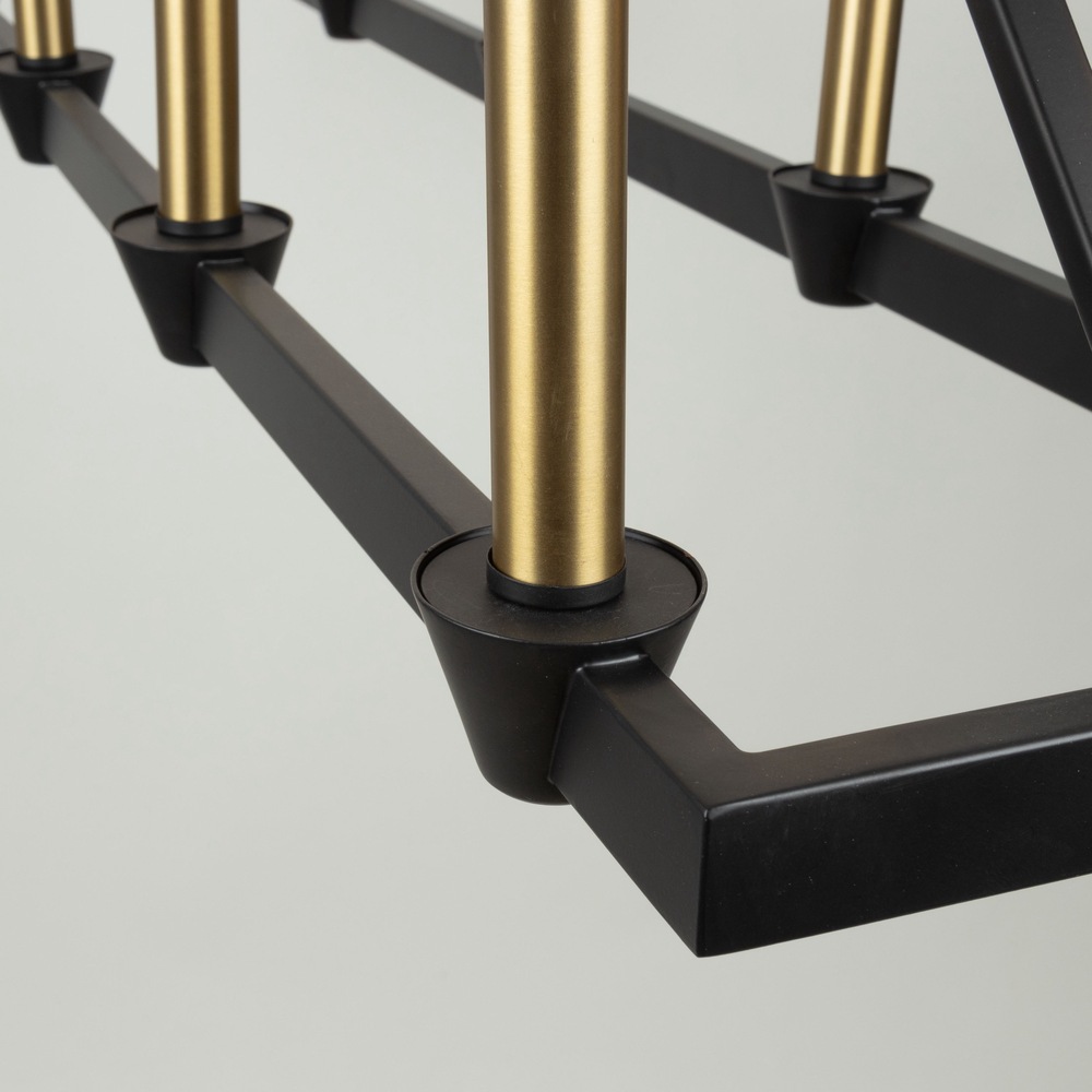 Created by designer Kevin Kraemer, the Notting Hill collection showcases a sophisticated design with black metal frames, exquisitely complemented by brass candle covers and accents. The combination of these finishes adds a touch of elegance and modernity to the collection, creating a visually striking and stylish visual. The use of specific elements highlights Kraemer's attention to detail and commitment to creating unique, contemporary pieces. The 10 light linear island chandelier is shown. (Height adjustable via chain)