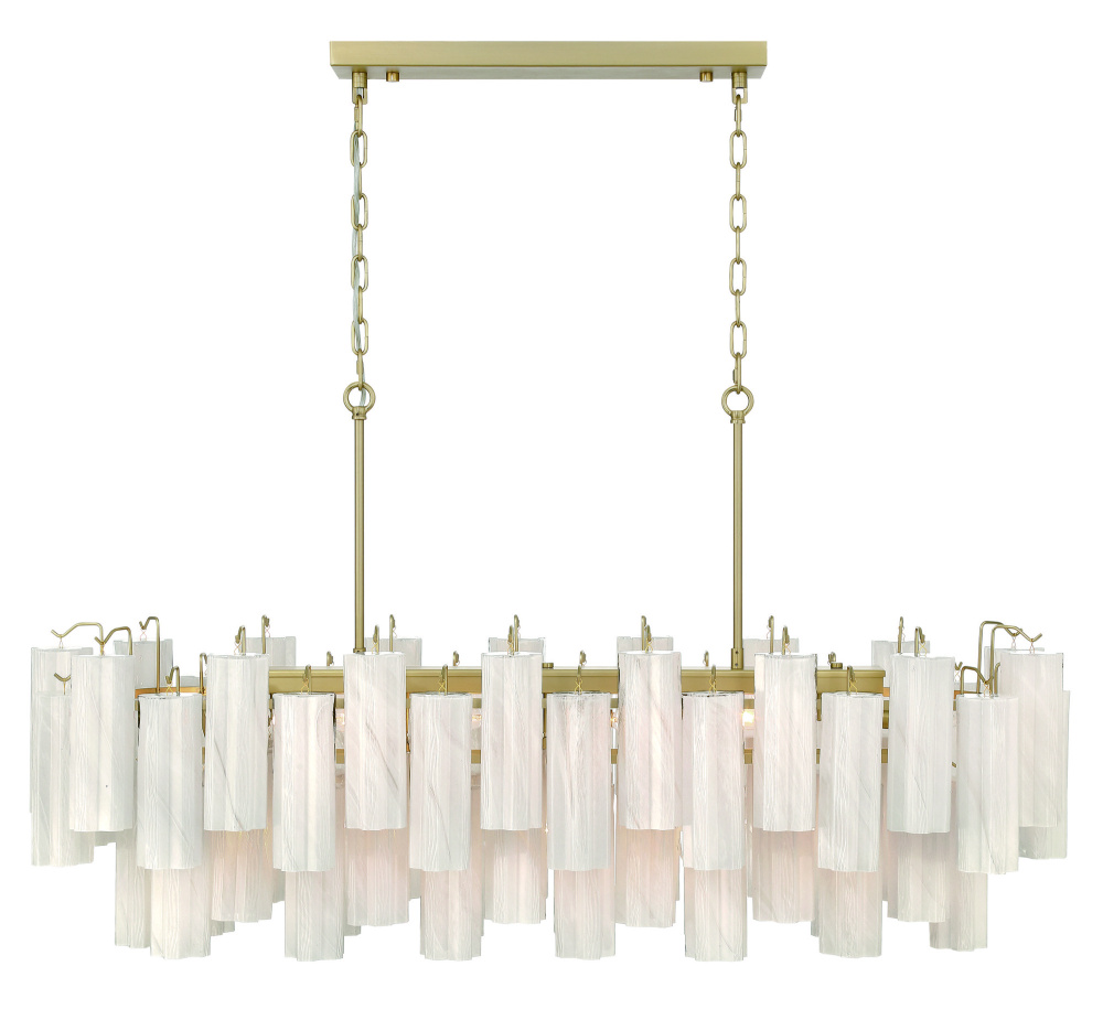 The linear island chandelier from the Sophia collection captivates with its cascading arrangement of ornate “Tronchi” style Wispy White glassware, reminiscent of shimmering icicles. Each glass element delicately refracts light, creating an enchanting glow, while the warm brass frame provides a refined contrast, evoking a sense of luxury. Perfect for classic and modern interiors alike, this design transforms any space into a haven of timeless beauty.