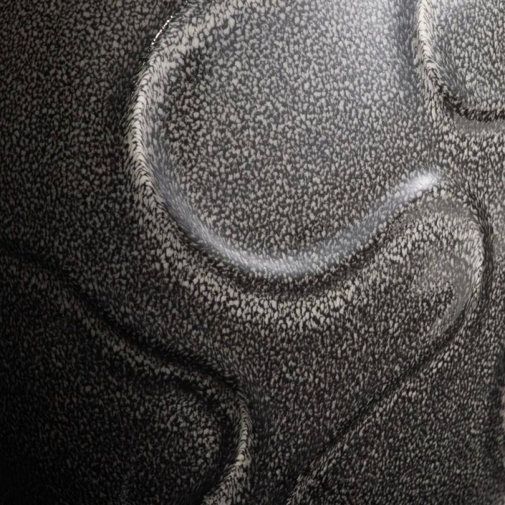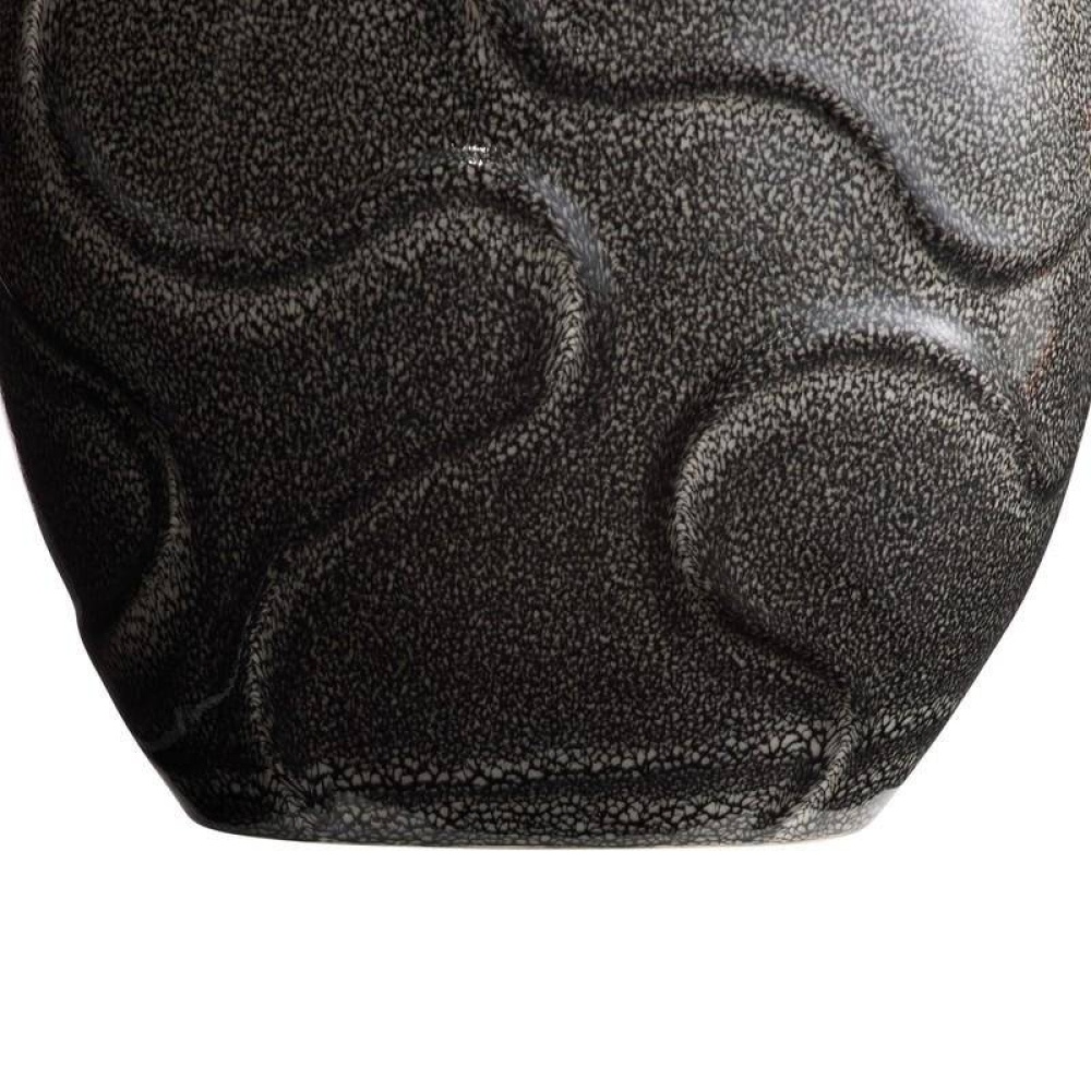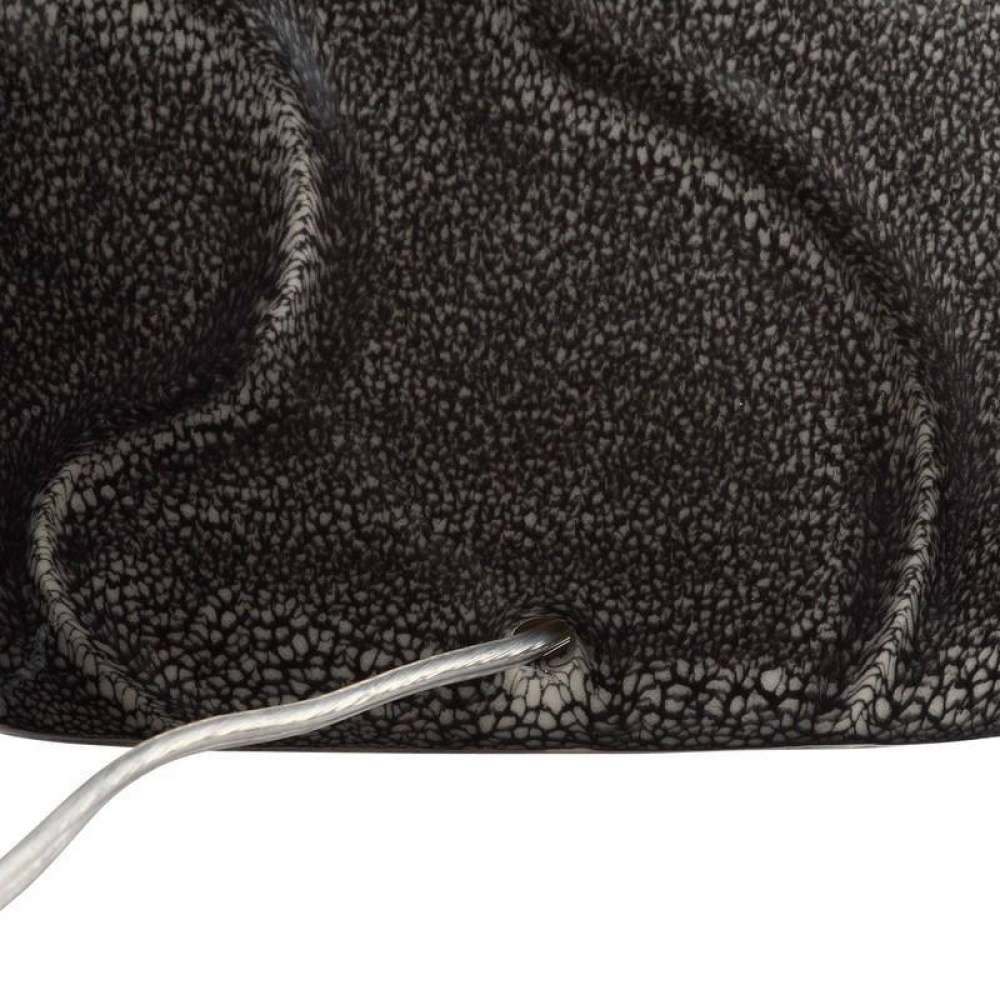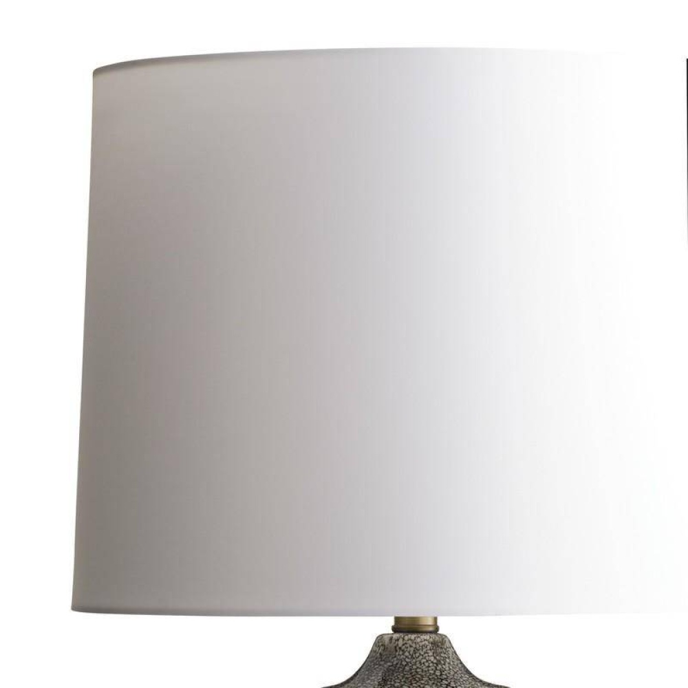 The porcelain lamp's reinvented organic silhouette is reminiscent of free-form brain coral or river rocks. The obsidian reactive glaze possesses a shagreen-inspired pattern to add an extra layer of texture. We designed the Ismay on a smaller, shallower scale to suit a narrow console or side table. Finished with antique brass hardware and finial and an off-white microfiber drum shade lined in off-white cotton. Finish will vary.
