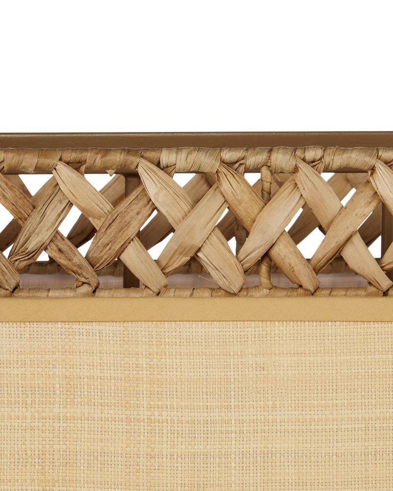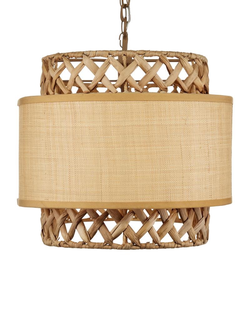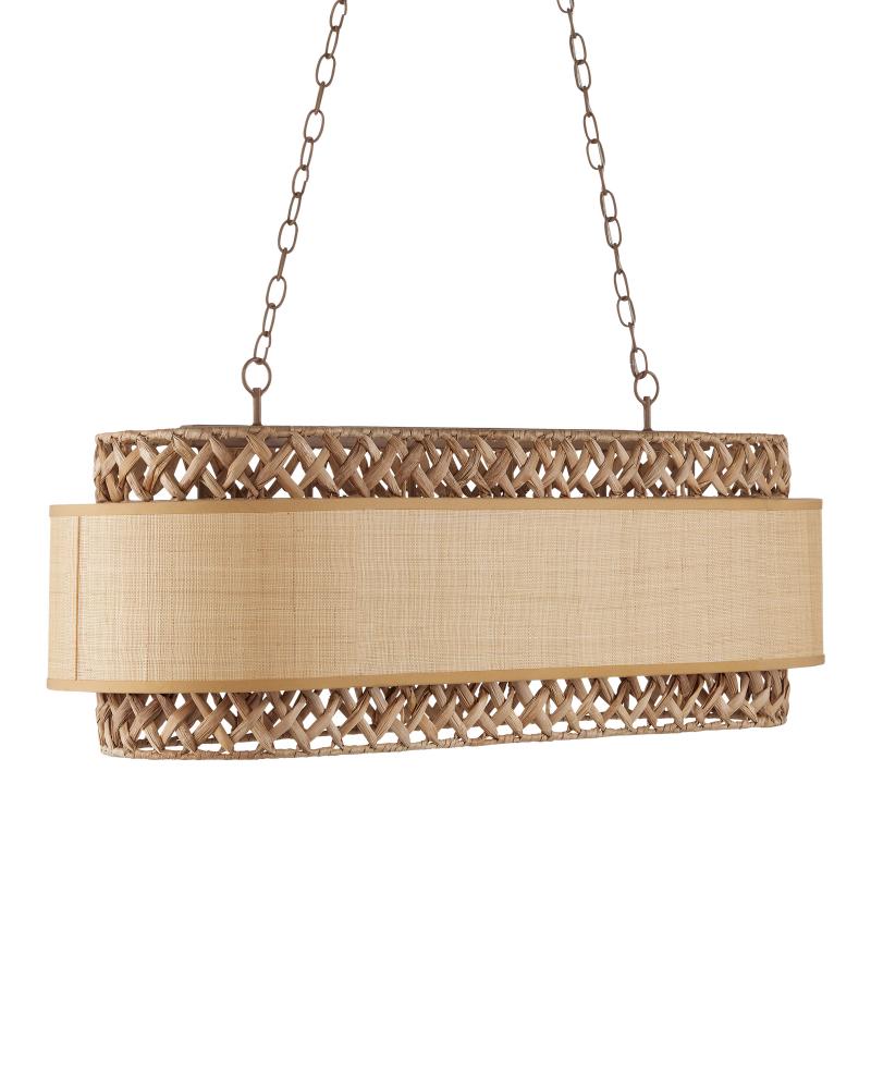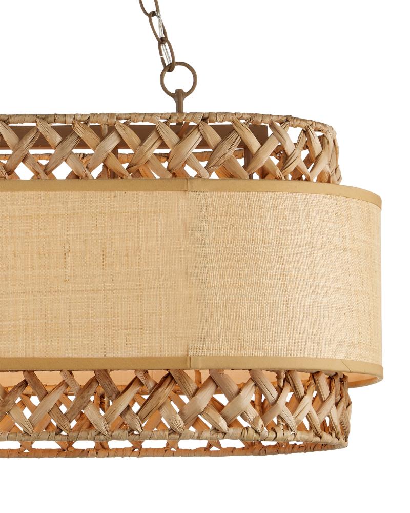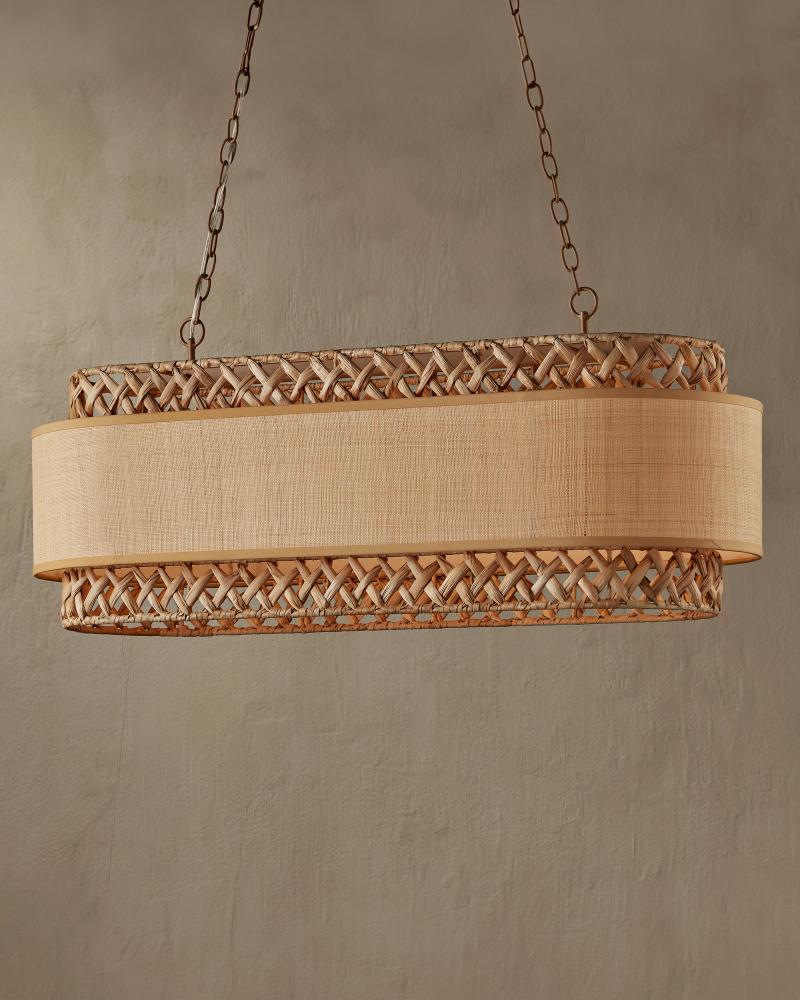 The natural material story continues with the Isola Chandelier with its wrought iron frame in a khaki finish and mix of natural water hyacinth and grasscloth fabric. The smaller, taller oval that encircles the light has a rough luxe weave of the water hyacinth; while the wider, shorter oval has a tighter weave that juxtaposes the looser crosshatching on this tan chandelier. A design detail of note is that the seams match up when the outer shade transitions from straight to curved. Adjustable from 34" to 100" with use of included chain/rod kit/cable. If your space calls for a longer drop, additional chain/rods/cable is available for purchase.