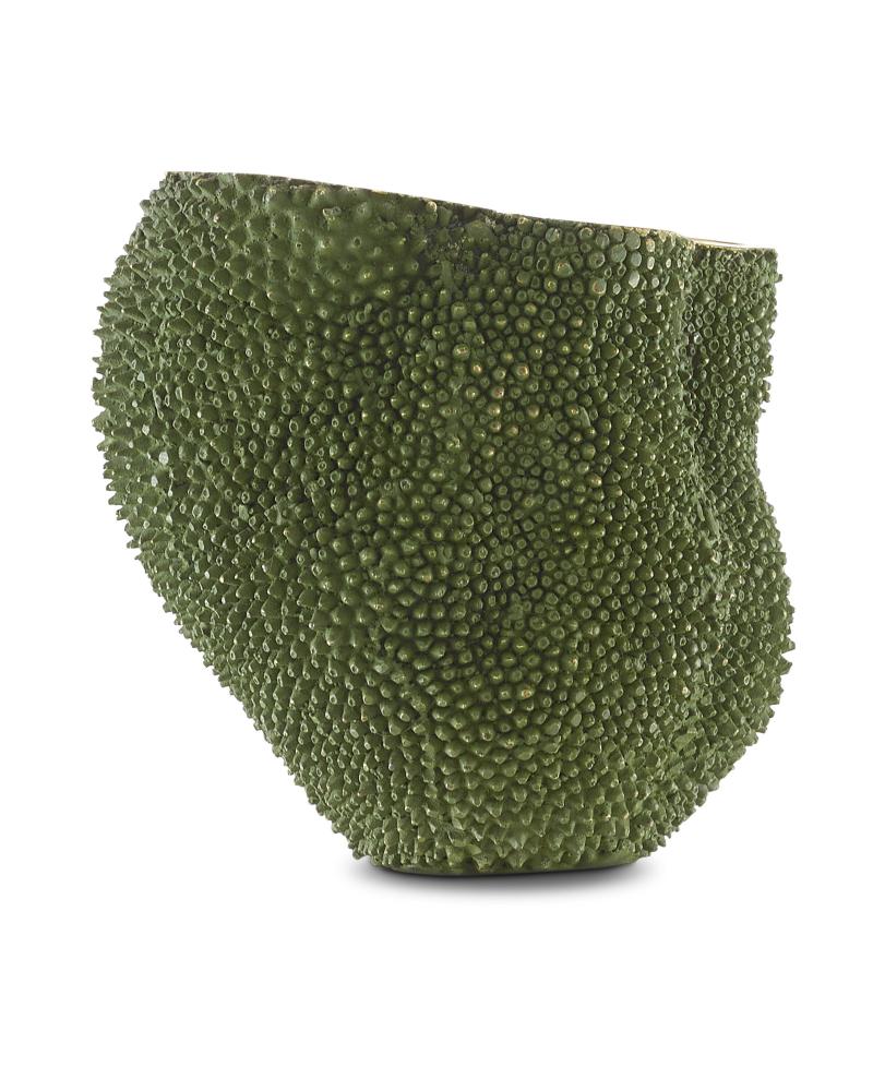 Our Jackfruit decorative vessels include the Jackfruit Medium Green Vase that is made from a lost-wax process so it reads as if it is covered in the skin of the jackfruit. The inside of each bronze vase is a brilliant gold made of polished solid bronze, which will need to be cleaned from time to time to maintain its sheen. These green decorative vessels are watertight so they will not leak.