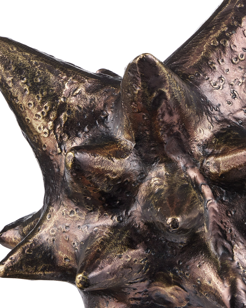 A pair of spiky decorative accessories, the Jacks Object Set includes two cast aluminum sculptures that gleam in an antique brass finish. Once the pieces are pulled from the mold, artisans treat them to the mottled finish that makes them looked aged.