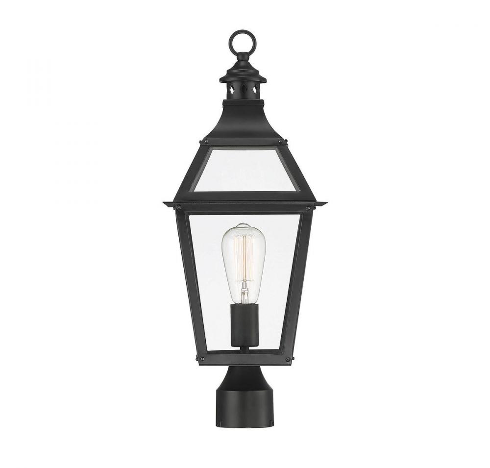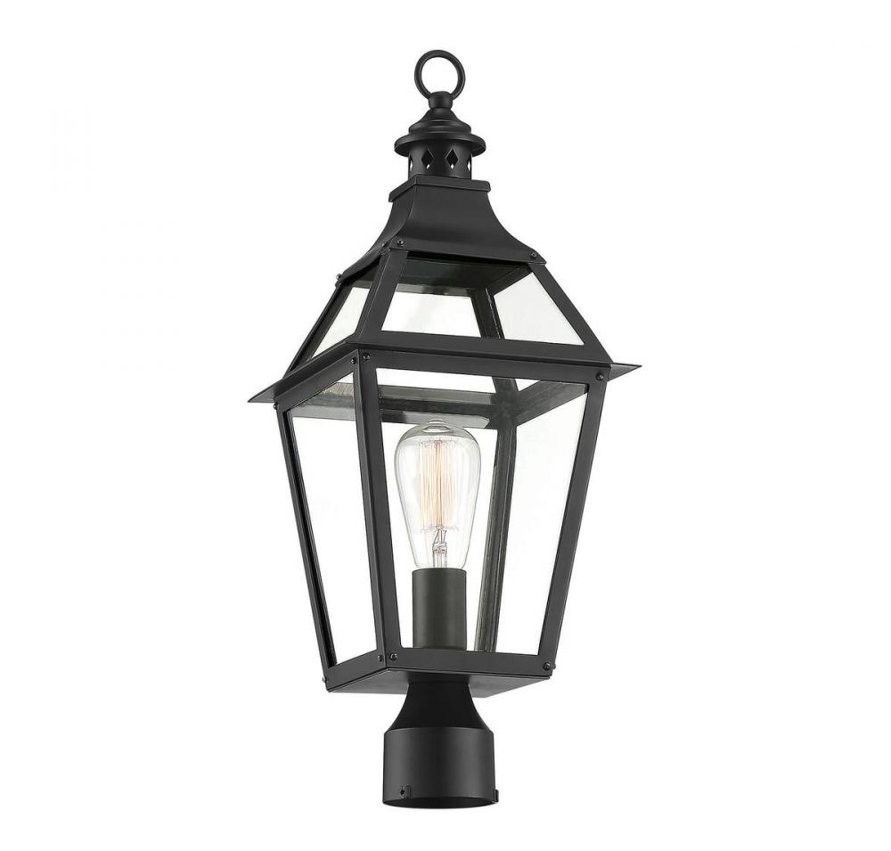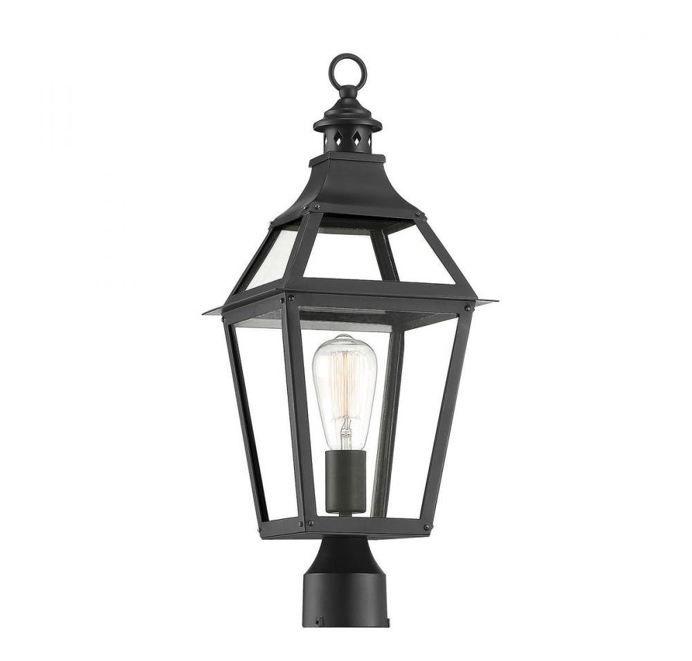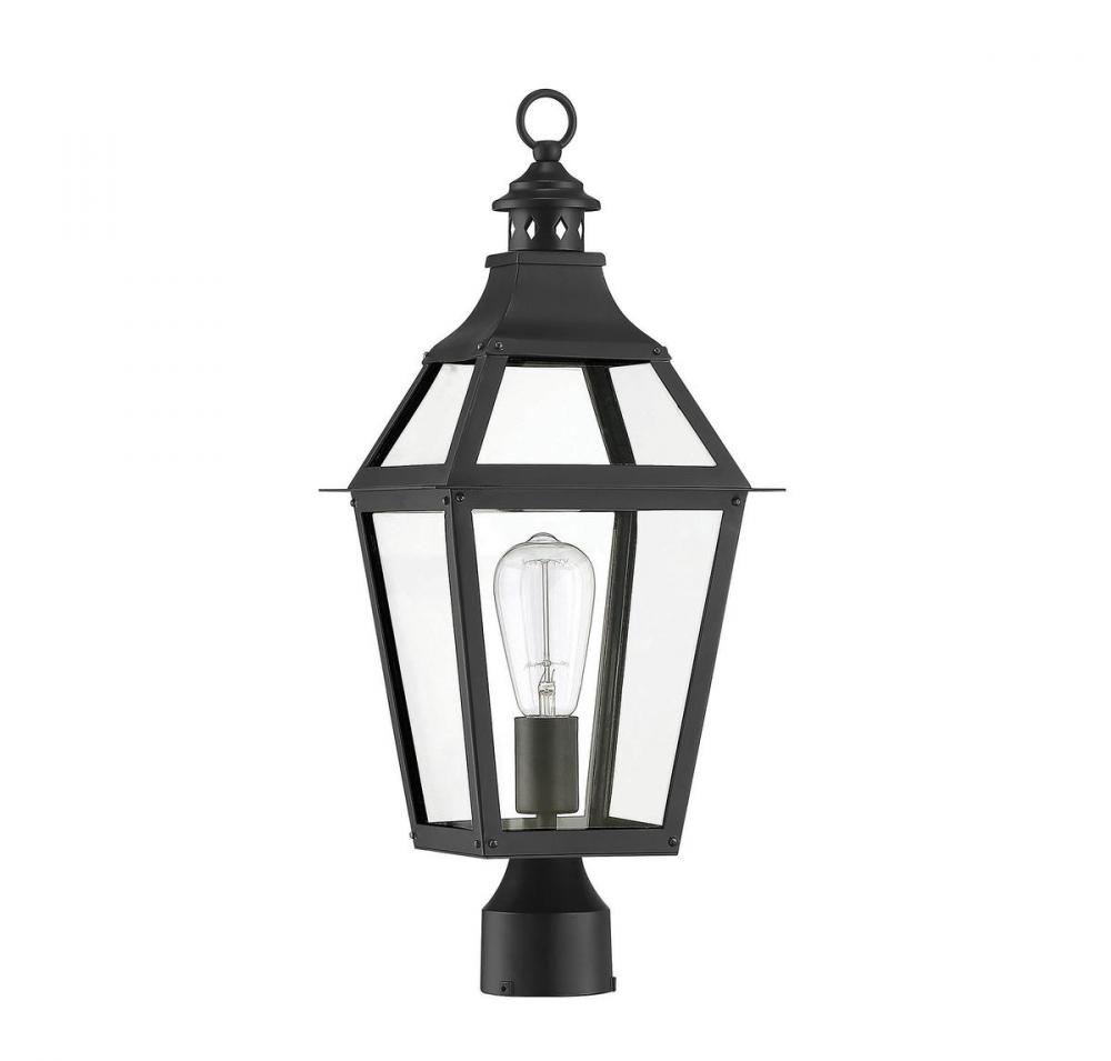 This Savoy House Jackson 1-light outdoor post lantern is the perfect way to easily boost your home’s curb appeal. It is crafted in a classic, timeless style with boldly angled curves, eye-catching pierced metal detail and panes of clear glass that ensure a bright, beautiful glow. Jackson is finished in black with gold highlights to go well with anything and add a touch of glamour. Use this post light to mark the start of your driveway, to illuminate stairs outside your home, to brighten up outdoor living spaces and more. This fixture is 9" wide and 22.75" tall. It fits posts and pier mounts that are 3" in diameter. Uses a standard size bulb of up to 60 watts (not included).