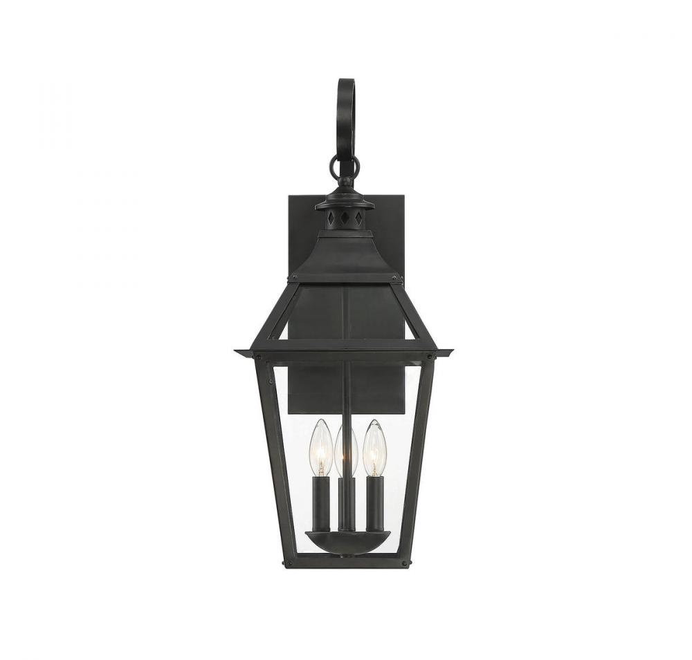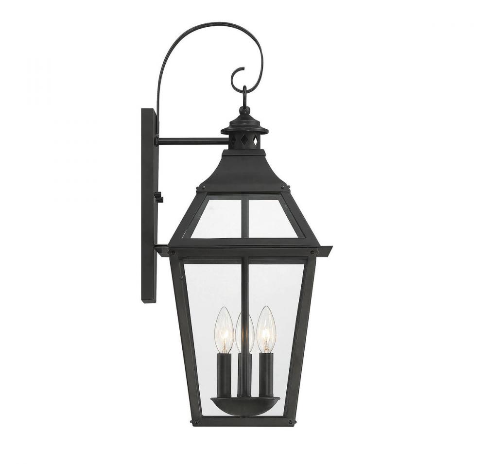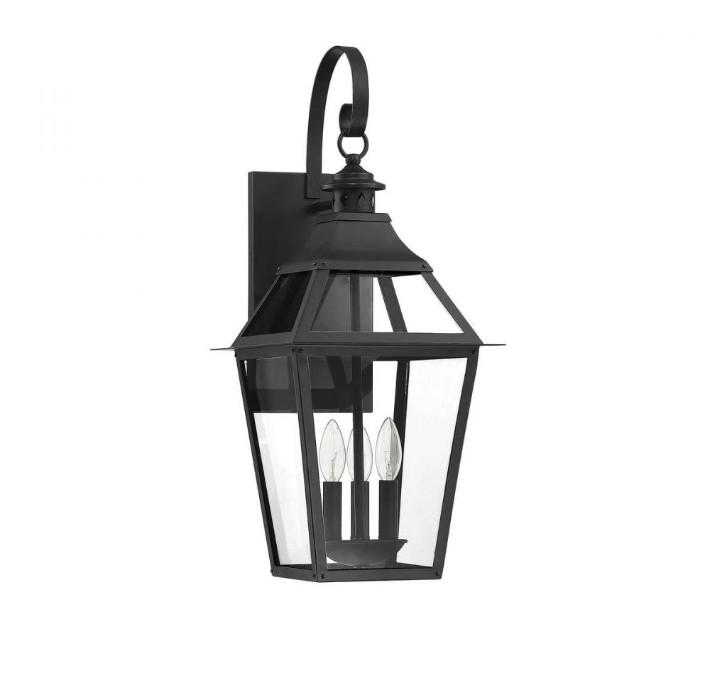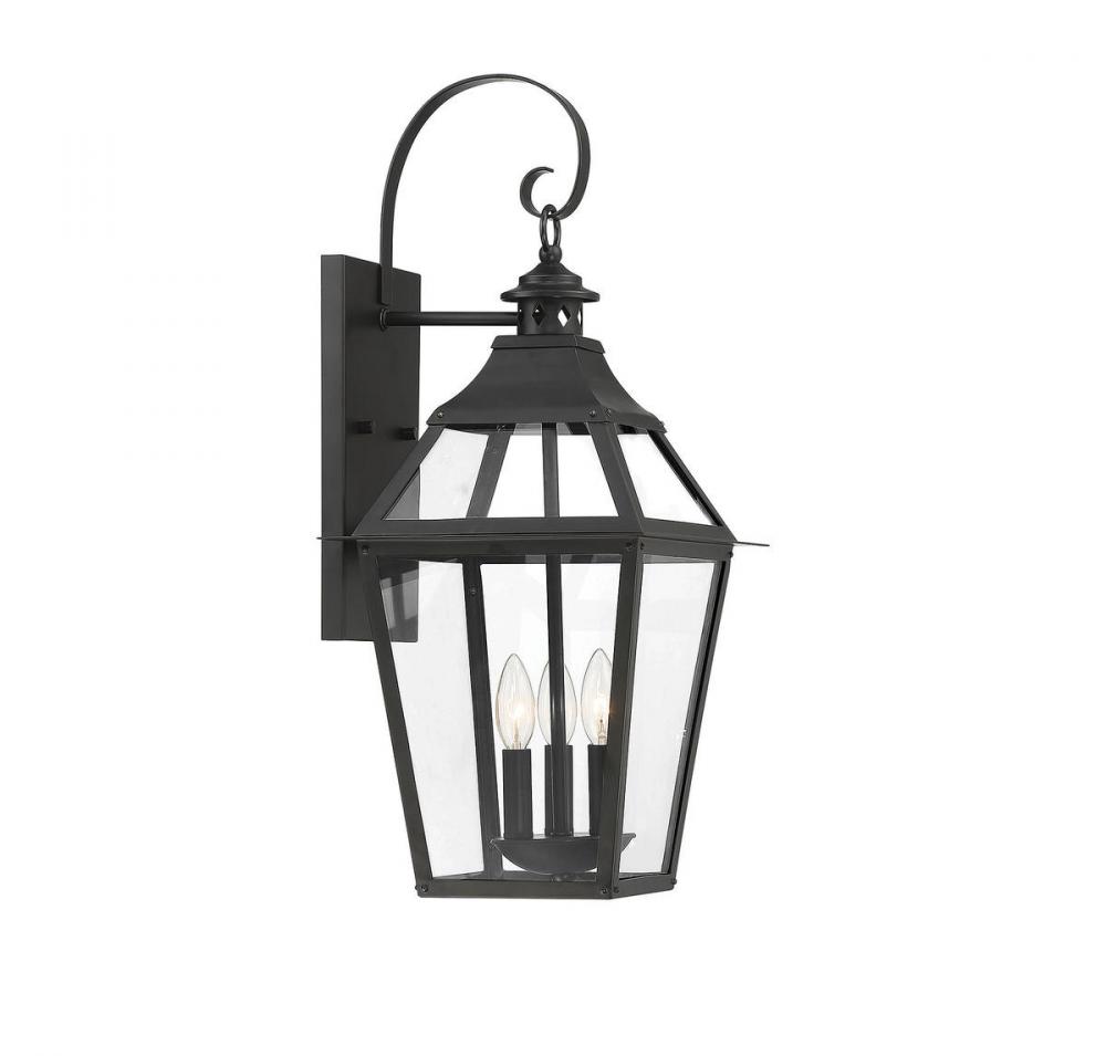 This Savoy House Jackson 3-light outdoor wall lantern is the perfect way to easily boost your home’s curb appeal. It is crafted in a classic, timeless style with boldly angled curves, eye-catching pierced metal detail and a dramatic shepherd’s hook. Panes of clear glass ensure a bright, beautiful glow and a generously sized backplate will help to cover any holes left from replacing previous fixtures. Jackson is finished in black with gold highlights to go well with anything and add a touch of glamour. Use this lantern beside your front and side doors or above your garage door. This fixture is 10.88" wide and 25.5" tall. It extends 11.75" from the wall. Uses 3 candelabra size bulbs of up to 40 watts each (not included).