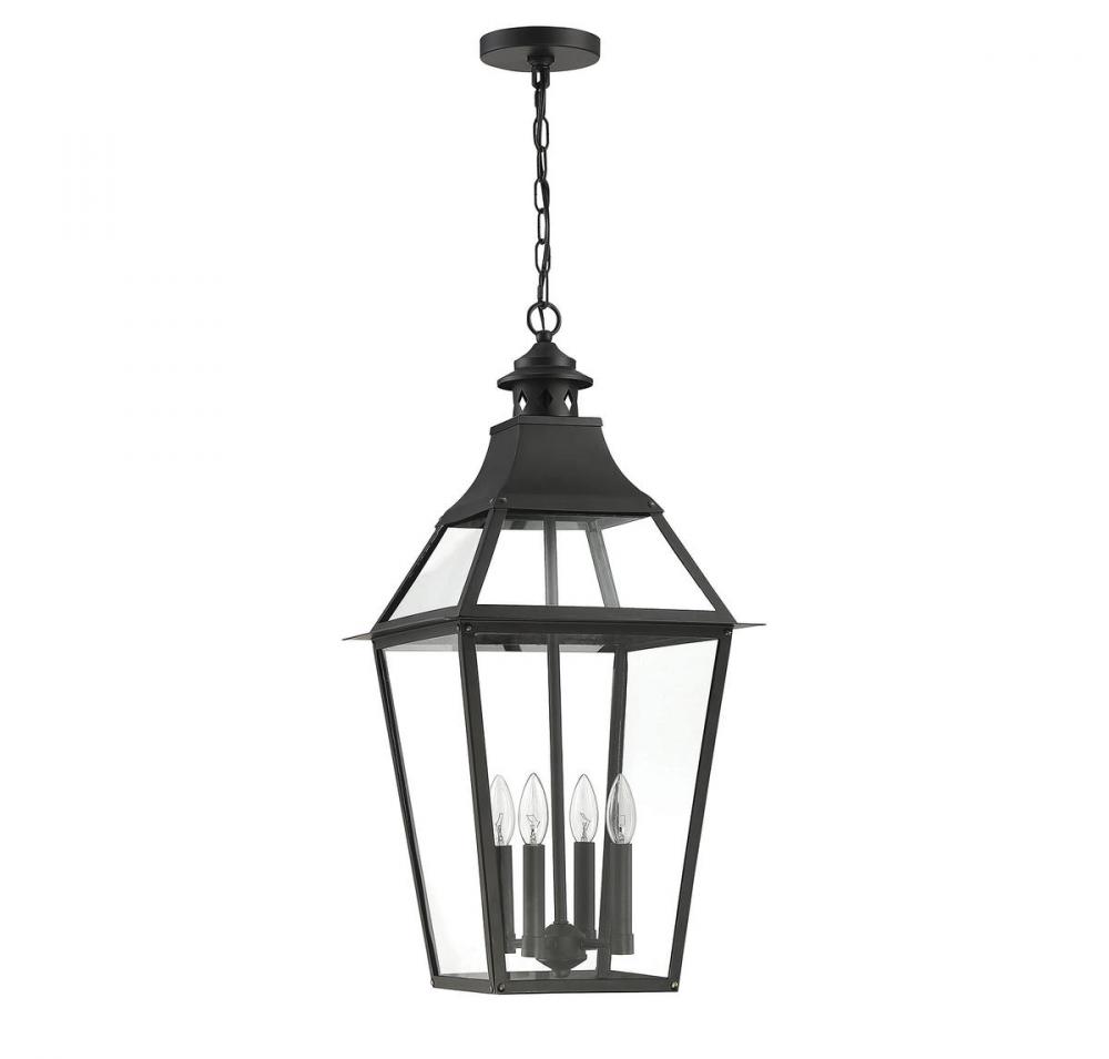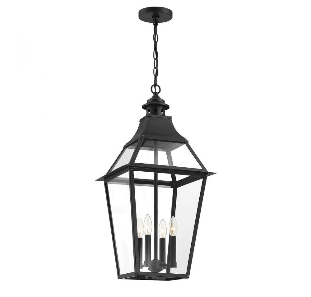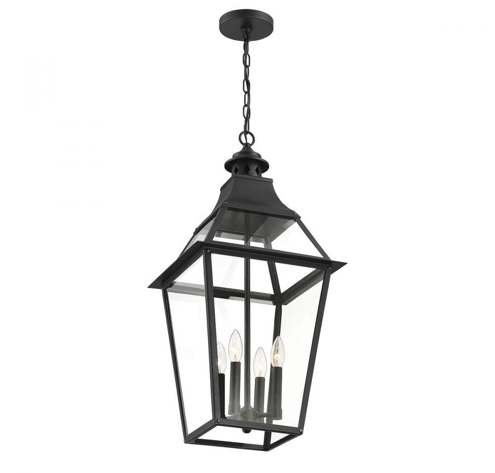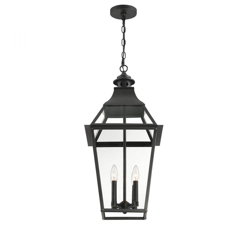 This Savoy House Jackson 4-light outdoor hanging lantern is the perfect way to easily boost your homeï¾’s curb appeal. It is crafted in a classic, timeless style with boldly angled curves, eye-catching pierced metal detail and panes of clear glass that ensure a bright, beautiful glow. Jackson is finished in black with gold highlights to go well with anything and add a touch of glamour. Use this lantern above your front door or in a covered area like a porch or patio. This fixture is 14" wide and 29.25" tall. Uses 4 candelabra size bulbs of up to 40 watts each (not included).